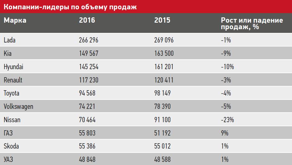 Десятка самых популярных у нас автомобильных марок за прошедший год почти не изменилась. Lada снова возглавляет рейтинг с серьезным отрывом от преследователей, второе и третье места с небольшой разницей занимают Kia и Hyundai. Как и в 2015 году список марок, преодолевших стотысячный рубеж, замыкает Renault. Новичок в «горячей» десятке лишь один – УАЗ. Ульяновцы заняли вакантное место отступившего с российского рынка Chevrolet, что не умаляет их коммерческого успеха, зафиксированного процентным ростом продаж. Еще лучше сработали на ГАЗе. Расширение модельной линейки «Газелей» помогло увеличить продажи на 9%. Но не все такие молодцы. Nissan закончил год с большим минусом в 23%. Причина тому скромный устаревающий модельный ряд без новинок.