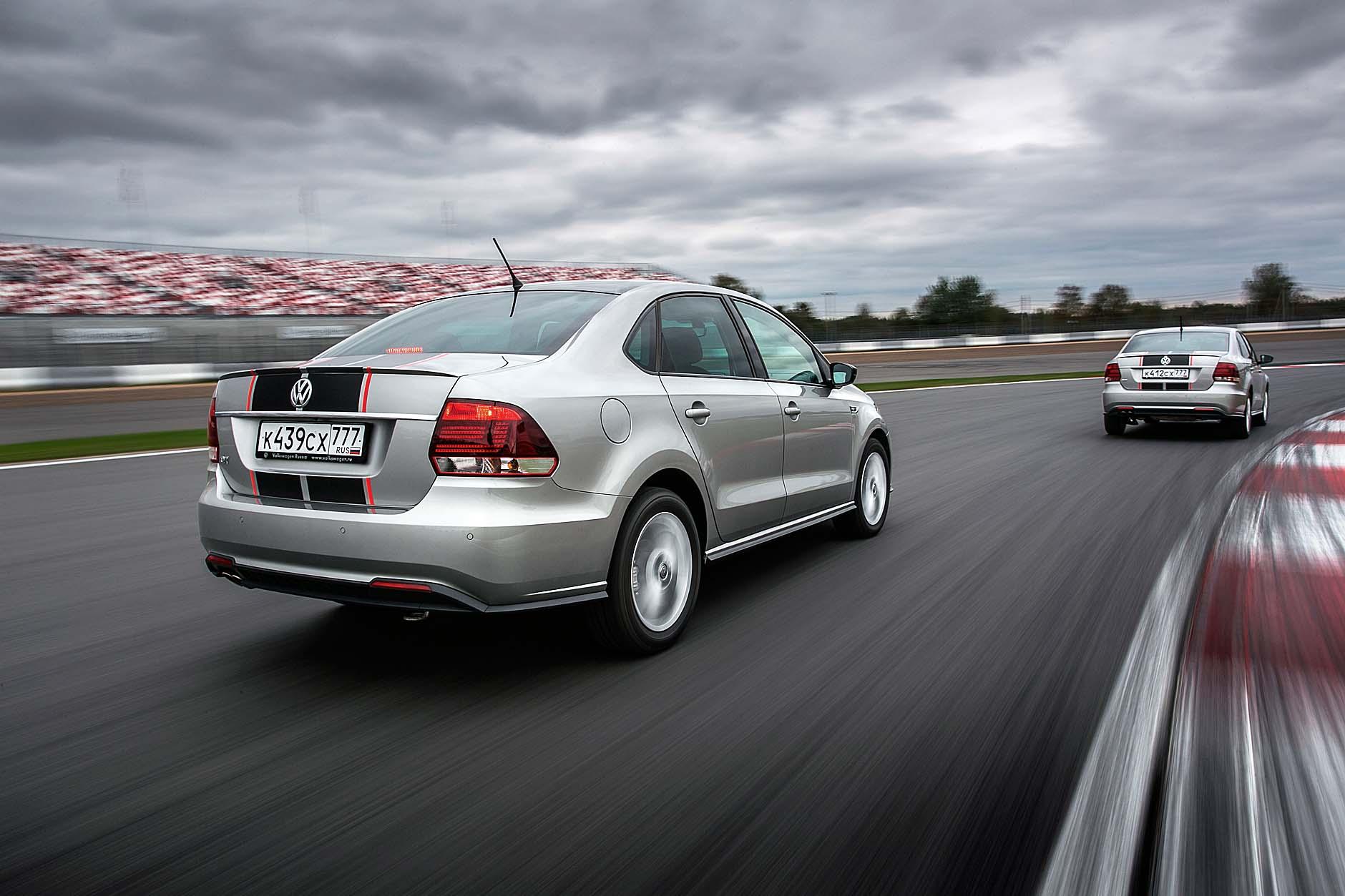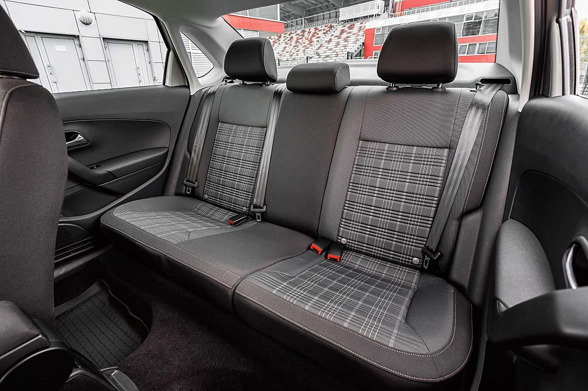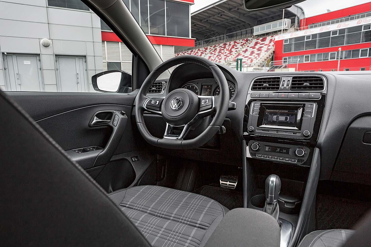 Отличия седана Polo GT от его стандартных собратьев преимущественно косметические. На него устанавливаются бамперы иной формы: передний сменил хромированные поперечные брусья на решетки с сотовой структурой, задний получил «юбку» из черного пластика, из-под которой выглядывает сдвоенный хромированный патрубок выхлопной системы. На крышке багажника – накладка-спойлер, корпуса боковых зеркал выполнены из глянцевого пластика, спереди, сзади и по бокам укреплены соответствующие шильдики. Кроме того, Polo GT полагаются 16-дюймовые колесные диски особого дизайна. Впрочем, такие можно заказать за отдельную плату и для «гражданского» седана в топовом исполнении Highline. Внутри – удобное рулевое колесо с усеченным ободом, как на хот-хэтче Golf GTI, и сиденья в серую клетку. Наклон спинки здесь меняется ступенчато, но подобрать удобную посадку нетрудно – получается несколькими движениями.