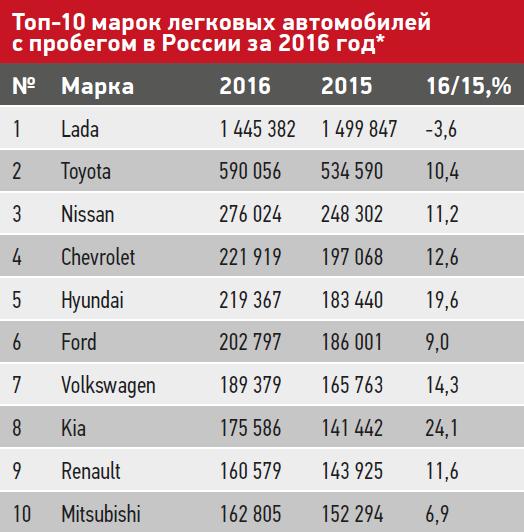 Второй по популярности маркой на «вторичке» стала Toyota c результатом в 590 056 автомобилей (+10,4%). На третье место вышел Nissan: 276 024 (+11,2%). Четвертую и пятую строчки заняли Chevrolet и Hyundai с показателями 221 919 (+12,6%) и 219 367 (+19,6%) соответственно. Марка Ford, чей Focus оказался в тройке лидеров, по общему объему продаж среди подержанных автомобилей оказалась лишь на шестой строчке – 202 797 единиц. И, тем не менее, продемонстрировала рост на 9%. Абсолютным же лидером по динамике роста оказалась марка Kia с увеличением продаж на 24,1% (175 586 машин против 141 442 в 2015 году). Впрочем, это не помогло ей подняться в общем рейтинге выше восьмой строчки, на которой она расположилась вслед за Volkswagen с результатом 189 379 (+14,3%). Замкнули же десятку лидеров Mitsubishi и Renault с результатами 162 805 (+6,9%) и 160579 (+11,6%).