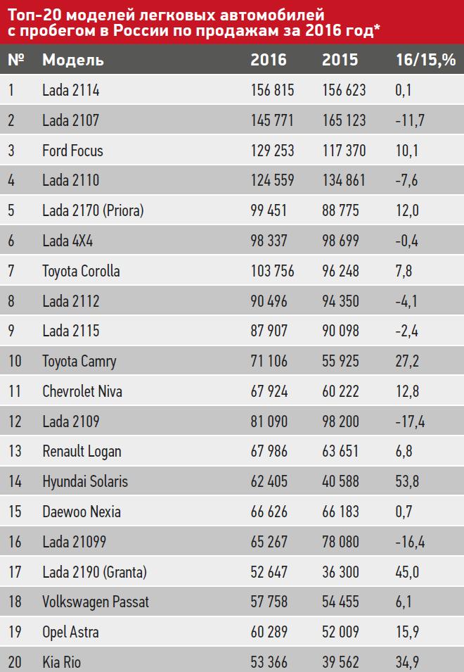 Лидером, несмотря на 3,6-процентное падение, осталась отечественная Lada. В абсолютных величинах это выглядит так: если в 2015 году на вторичном рынке было совершено 1 499 847 сделок по купле-продаже продукции «АвтоВАЗа», то в 2016 этот показатель составил 1 445 382. Самой популярной «Ладой» осталось пятидверка семейства Samara II (ВАЗ 2114) с показателем в 156 815 машин. Причем это на 0,1% больше, чем годом ранее. Следом расположилась «классика» в лице ВАЗ 2107. Правда «семерок» было реализовано на 11,7% меньше, чем в 2015 году: 145 771 против 165 123. Третье место заняла «десятка» с результатом в 124 559 единиц. Впрочем, в абсолютном зачете седан ВАЗ 2110 расположился на четвертой строчке, уступив третью Ford Focus. В 2016 году «гольф-класс» американского производителя выбрали 129 253 покупателя против 117 370 в 2015, обеспечив модели 10,1-процентный рост.