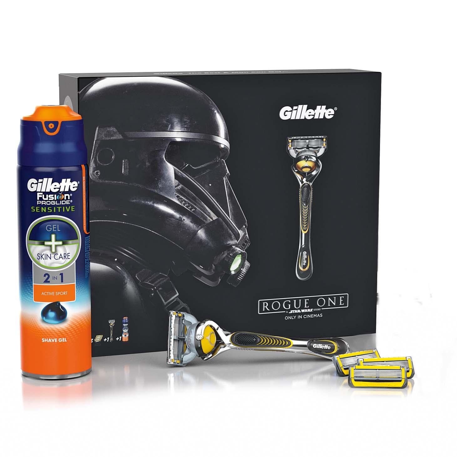 Набор Gillette Fusion ProShield специальной лимитированной серии «Изгой-Один. Звёздные Войны: Истории» подарит идеально гладкое бритье. В набор входят новая мужская бритва Fusion ProShield, три сменные кассеты и гель для бритья ProGlide Sensitive 2-в-1. Бритва Fusion Proshield с новой технологией сменных кассет со смазывающими полосками до и после лезвий защищает от раздражения.