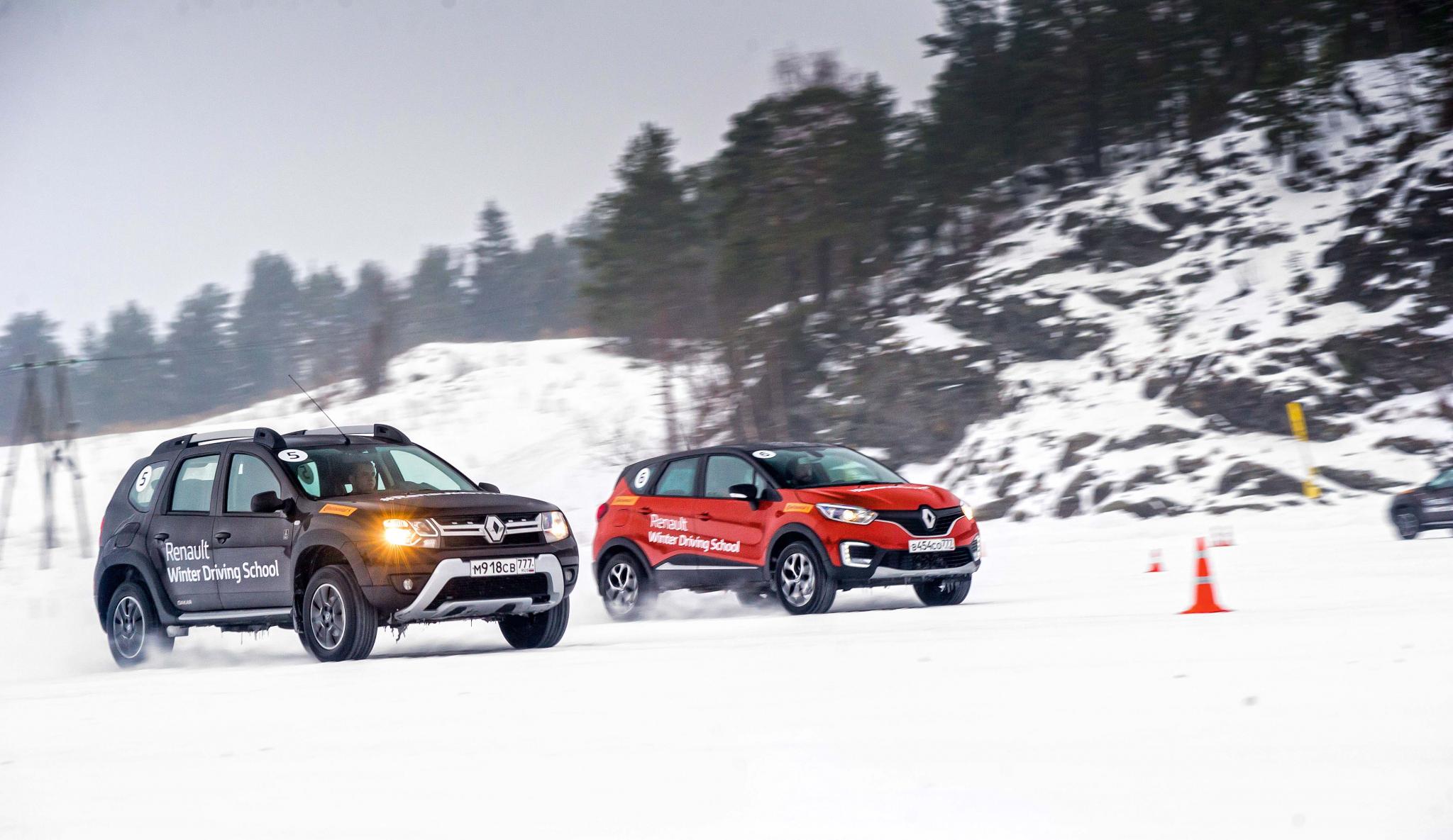 После этого представить Duster чисто выписывающим восьмерки на льду было ну очень сложно. И вот – Карелия, хорошенько промерзшее Ладожское озеро в районе Сортавалы, «Зимняя школа вождения Renault». Ученики делят между собой несколько автомобилей Duster и Kaptur и выезжают на лед, где их ждут совершенно стандартные для подобных мероприятий упражнения. Разные скоростные змейки, особенно веселые при прохождении в управляемом ритмическом заносе, езда по извилистой ледяной трассе на время, «облизывание» конусов с разными техниками и разными смыслами, гонки на овале-«ипподроме» и под конец – полицейский разворот. Это все хорошо знакомо участникам зимних программ Audi, Porsche и BMW, но тут-то учат экстремальным маневрам не на спорткарах!