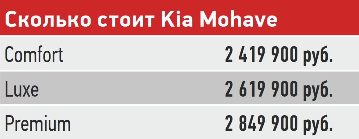 Дизель V6 мощностью 250 л.с. в сочетании с оперативно меняющим передачи 8-ступенчатым автоматом наделяет Mohave похвальной динамикой, вполне стабилен этот автомобиль и в «крейсерском» режиме на высокой скорости – дефекты дорожного полотна преодолевает с достоинством, лишь слегка покачиваясь, словно на волнах. А вот в стесненных городских условиях неизбежно приходится учитывать внушительную длину и колесную базу, активно действуя рулем и разворачиваясь в узких переулках в несколько приемов. Не получится на таком автомобиле и энергично проходить повороты – подвеска с пневмобаллонами на задней оси и пружинами спереди явно спроектирована с расчетом на спокойное размеренное движение.