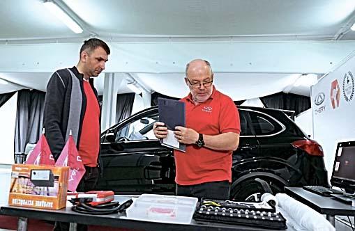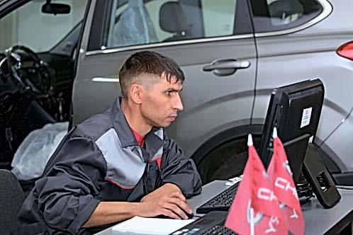 Неподалеку – столы, напоминающие школьные парты. Рядом – два кроссовера Chery Tiggo 5, около каждого размещено по столу и по два компьютера. Здесь по очереди и демонстрируют свои навыки конкурсанты. За ними внимательно наблюдает крепкий, невысокого роста мужчина в очках – это Виктор Гуров, руководитель учебно-методического центра и по совместительству член жюри. Он распоряжается всем процессом: приглашает участников «к станку», консультирует их, а потом оценивает выполнение заданий и выставляет баллы.