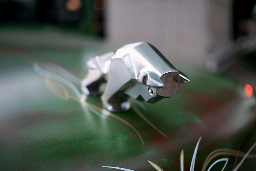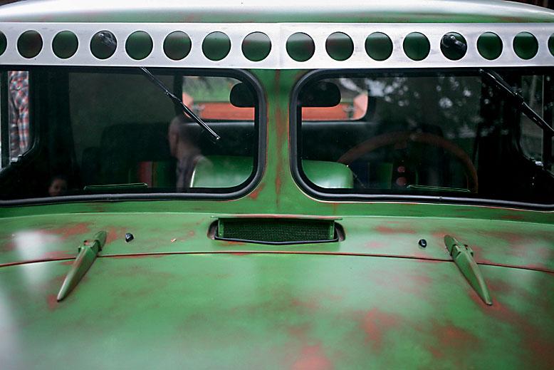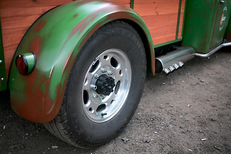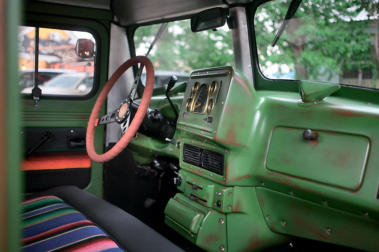Здесь, кстати, снова пригодились отдельные приборы и элементы от донорского Chevrolet Suburban. Тот, кто ездил на чем-то подобном, наверняка узнает характерную «субурбановскую» «приборку». Интересно то, что в интерьере практически нет пластика – дефлекторы системы вентиляции не в счет. Все остальное сделано из такой же стали, как и внешние панели кузова. Брутальность цельнометаллического салона разбавляет лишь веселенькая обивка сидений, изготовленная из самого настоящего мексиканского пончо – кому-то пришлось пожертвовать сувениром, привезенным из турпоездки. За кабиной на раму установили чисто декоративный кузов из полированного красного дерева. Понятно, что он не предназначен для перевозки каких-либо утилитарных грузов. Единственное, что можно там разместить, – это мотоцикл. Для него даже специальное крепление предусмотрено. А как же иначе, если и заказчик, и создатель «Маззи» – оба большие любители и ценители мотоциклов?