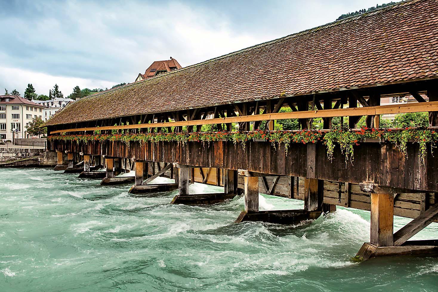 Этот деревянный мост в городке Тун служит людям вот уже три столетия Представьте себе европейскую страну, где на столичных улицах нет пробок, где днем, поднявшись в горы, можно поиграть в снежки, а уже вечером в долине нырнуть в теплую воду кристально чистого озера и где любой желающий может приготовить себе настоящий сыр или шоколад. Сказка, утопия? Ничуть! Это – Швейцария, по которой мы проехали на Land Rover Discovery Sport