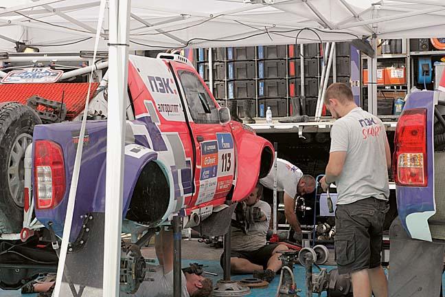 За остаток дня после гонки и ночь командам нужно провести полную ревизию техники. Проверить тормоза, подвеску, натяжение ремней, цепей и всего остального. Все это разобрать, починить, если надо, установить новые агрегаты (у кого есть в запасе), а потом собрать автомобиль. И начинается работа механиков. Кто под навесом, кто под открытым небом. За вечер и часть ночи им удается сделать то, на что обычной СТО потребуется две недели. Еще в полночь многие машины стоят разобранные до каркаса, но утром выходят на старт свеженькие, словно огурчики. Когда механики спят? Непонятно. Может, днем в дороге?