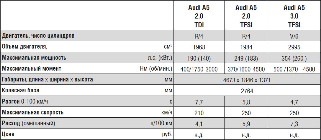 На нашем рынке немцы решили предлагать всего два мотора – дизель 2.0 TDI мощностью 190 л.с. и бензин 2.0 TFSI. «Исходная» мощность второго – 252 л.с., но для России его дефорсировали до 249 л.с., чтобы покупатели могли сэкономить на транспортном налоге. Так, благодаря разнице в 3 л.с. московские владельцы Audi A5 будут ежегодно платить на 19 125 руб. меньше. Впрочем, после поездки на новом купе говорить о таких приземленных вещах как экономия и всякие налоги не хочется.