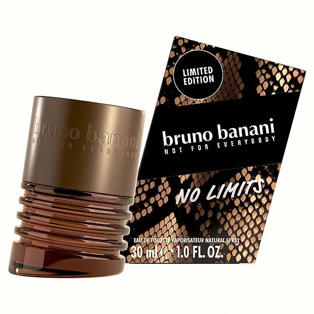 Парфюмерный бренд bruno banani, запускает свою первую лимитированную линейку ароматов No Limits. Новый аромат для мужчин раскрывается фруктовой свежестью аккорда гуараны и красного яблока в сочетании с нотой ореха. Ключевой аккорд гипнотической древесной ноты и ветивера помогает избавиться от предрассудков и проявить себя с новой стороны. Аромат содержится в золотисто-коричневом флаконе, а его упаковка украшена рисунком в виде змеиной кожи. Новинка будет доступна в формате туалетной воды объемом 50 и 30 мл.