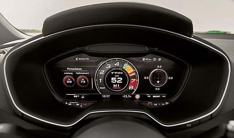Интерьер ТТ с приставкой RS практически не отличается от менее злой Audi TTS. Разве что за счет небольших штрихов вроде красной кнопки на руле и карбоновых вставок на передней панели салон смотрится агрессивнее и «острее». Кроме того, для версий RS фирменный виртуальный кокпит получил расширенный функционал. Так, на дисплей, помимо данных о скорости и подсказок навигационной системы, выводится информация о давлении в шинах, распределении тяги по колесам и о боковых нагрузках. И это только добавляет азарта!