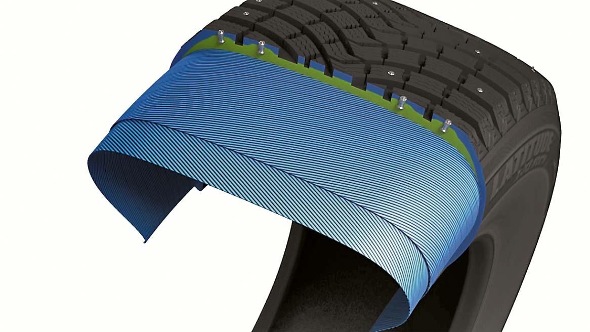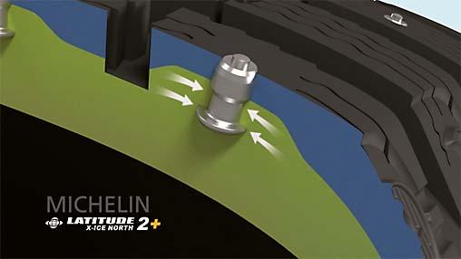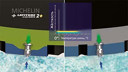 Для того, чтобы заставить шипы эффективнее работать на льду, специалисты компании сделали протектор двухслойным. Внутренний термочувствительный слой резиновой смеси при низких температурах становится ощутимо тверже, и шипы, упираясь в надежное основание, эффективнее вгрызаются в лед. В теплую погоду он наоборот приобретает большую эластичность, шипы сильнее утапливаются в поверхность, позволяя резине эффективнее работать на асфальте. Таким образом, благодаря оптимизированному составу смеси удалось улучшить поведение Latitude X-Ice North 2+ на льду вне зависимости от его состояния.
