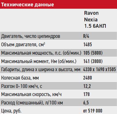 Российскому покупателю доступна Nexia всего с одним мотором объемом 1,5 л. Его мощность равна 105 л.с. В паре с ним трудится 6-ступенчатый автомат (в базовой комплектации – 5-ступенчатая механическая коробка передач). Тандем не самый выдающийся. С ним Nexia разгоняется до 100 км/ч не только медленно (на преодоление отметки в 100 км/ч ей требуются долгие 12,2 с), но еще и шумно. Как только стрелка тахометра преодолевает рубеж в 3-4 тыс. оборотов, салон заполняет гул. На шумоизоляции моторного отсека в Ravon, похоже, решили сэкономить. Поведение на дороге предсказуемо для автомобиля с таким ценником – не самое четкое прохождение поворотов, «ватный» руль с слабой обратной связью, немалые крены кузова. А вот по энергоемкости перенастроенная специально для России подвеска оказалась не так уж и плоха. С такими характеристиками амортизаторов можно, не сбавляя скорости, проезжать даже по крупным неровностям. Для жителей регионов этот навык, пожалуй, важнее, чем динамика или управляемость.