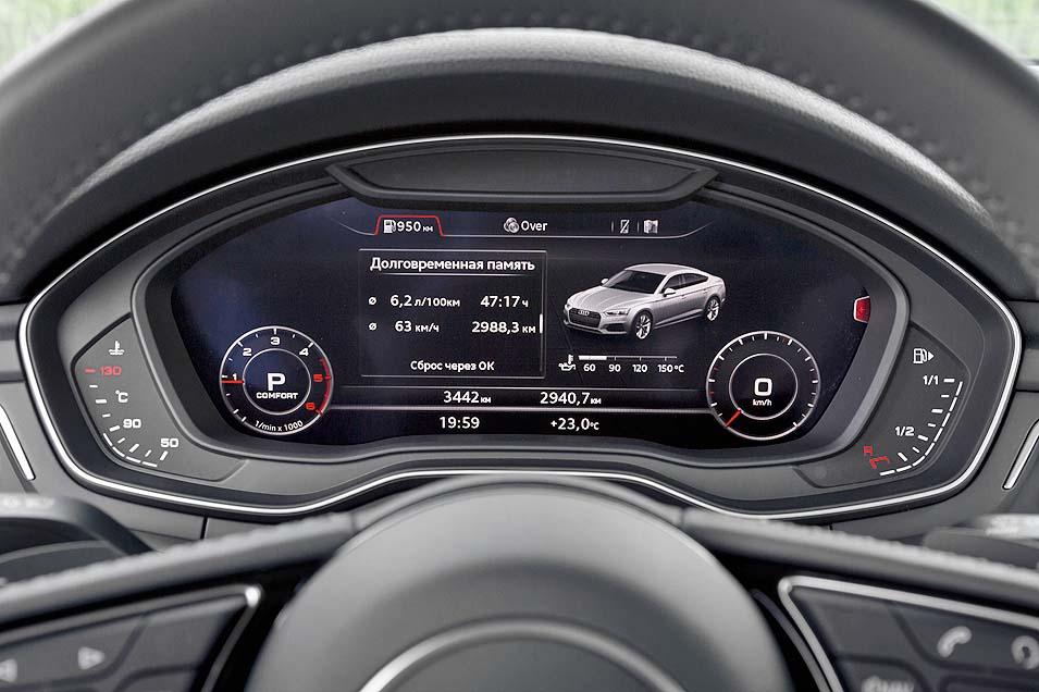 Не суть. Главное, что вместе со стилем эволюционировали и размеры. Пятидверное купе – хэтчбеком такую красоту и называть-то странно – более радушно принимает седоков на борт. Дополнительные сантиметры в базе явно освободили от нежелательного контакта со спинкой кресел колени задних пассажиров, голове которых не грозит интимная близость с довольно покатым потолком благодаря углубленному профилю дивана. Комфорта существованию добавил и трехзонный климат-контроль – опция из тех, от которых отказываться вряд ли стоит. А вот насчет необходимости виртуального щитка приборов придется призадуматься. Информативно, удобно, красиво – кто спорит? Однако Audi virtual cockpit стоимостью 35 000 руб. требует обязательного заказа навигации еще за 200 000 руб. Это почти 10% от стоимости автомобиля. Не многовато ли за спецэффекты?