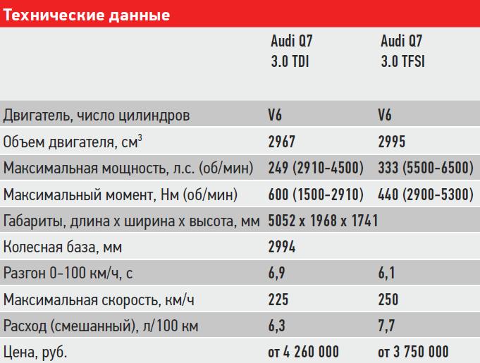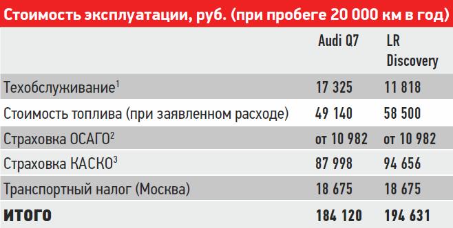 А Land Rover Discovery даже на асфальтированной дороге никак не может выйти из образа покорителя сурового бездорожья. Он менее собран, менее отзывчив к рулю, допускает больше раскачки. При этом на дороге Land Rover более плавный и степенный, лучше сглаживает любые – что мелкие, что крупные – огрехи покрытия. Audi Q7 более требователен к качеству дорожного полотна – большие выбоины и неровности он пролетает, словно не замечая, а вот мелкую рябь – недолюбливает. При этом «немец» быстрее. Audi Q7 добирается до отметки 100 км/ч всего за 6,9 с, а «Дискавери» на это требуется 8,1 с. И, что немаловажно, при всей своей прыти немецкий кроссовер более экономичен – в смешанном режиме он потребляет на 1,2 л меньше (6,3 л против 7,5 л) топлива, чем Land Rover.