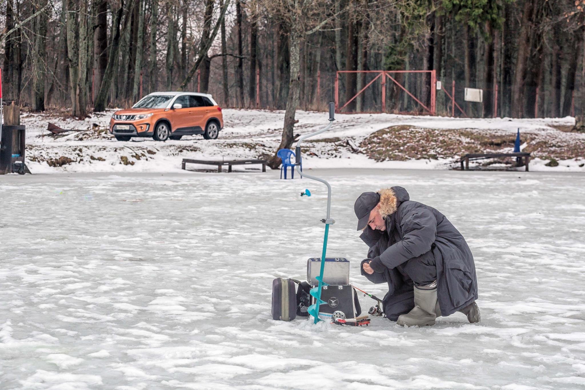 Откуда на прудах лед, непонятно. Морозов не было, дожди. Но пробурились... Надежды возлагались на вертикальные блесна. Рыбак всегда в движении подстать самой форели. Ставить жерлицы с живцами не хотелось, совсем не спортивно. Да и ловить на пасту скучно. Замираешь на час, ожидая поклевки. Обмотанный кислотного цвета пастой крючок смотрится в воде совсем чужеродным элементом. Не то что оранжевый автомобиль с «заснеженной» крышей в усадьбе Апраксиных, когда свежесть дизайна машины только подчеркивает почтенный возраст окружающих стен. Словом, сплошная гармония...