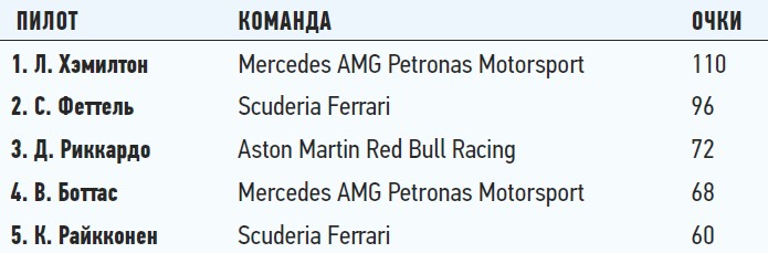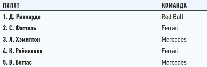 Первая шестерка гонщиков как стартовала, так и финишировала – ехали друг за другом паровозиком. Даниэль Риккардо, Себастьян Феттель и Льюис Хэмилтон в итоге оказались на подиуме. Феттель все время держался близко к Риккардо, но так и не провел ни одной атаки, словно надеясь, что Red Bull вот-вот сойдет с дистанции, подарив Ferrari победу. Четвертое и пятое место разделили два финна – Кими Райкконен и Валттери Боттас.