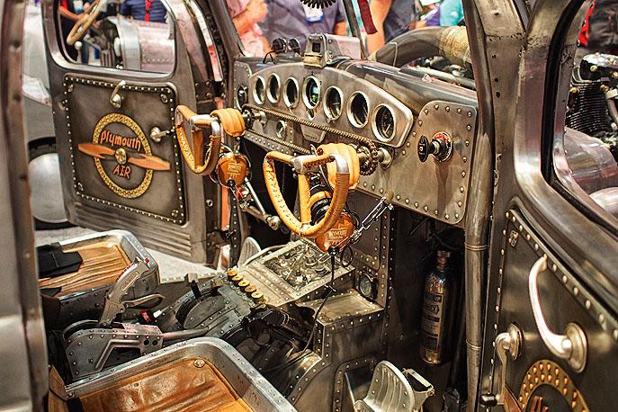 Это интерьер автомобиля Plymouth Radial Air, под капотом которого установлен 7-цилиндровый двигатель от Cessna 195 мощностью 300 л.с. Здесь все, как у самолета: 2 штурвала, комбинация приборов во всю длину панели, всевозможные тумблеры и рычажки, наушники с микрофонами для переговоров.
