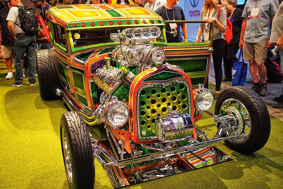 Интересно, как бы отреагировал Генри Форд на подобные эксперименты c Ford Model A? Мало того, что в машину поставили огромный двигатель, закрывающий водителю обзор, да широченные задние колеса, занизили крышу, так еще кузов раскрасили всеми оттенками зеленого и желтого цветов. Как минимум получилась хорошая реклама автомобильным краскам.