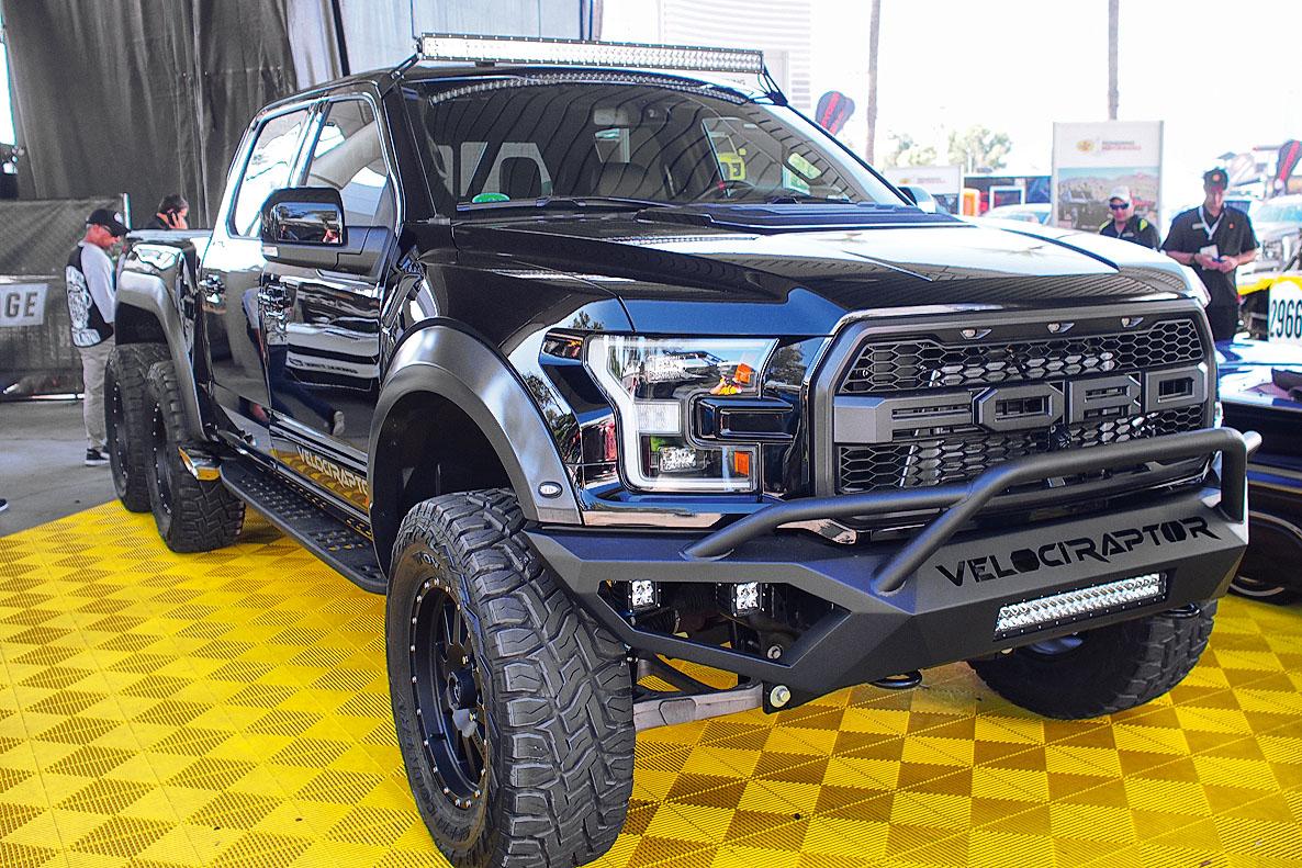 Один из самых заметных автомобилей на выставке SEMA Show расположился на открытой площадке перед павильонами выставочного центра в Лас-Вегасе – этому автомобилю тесно внутри. Гиганту Ford F-150 Velociraptor 6x6, «прокачанному» известной мастерской Hennessey, увеличили мощность 3,5-литрового двигателя EcoBoost с 456 до 600 л.с., в результате чего разгон с места до 100 км/ч занимает всего 4,2 с. И это не все! Машине добавили еще одну пару колес, усилили подвеску, поставили стальные бамперы, дугу безопасности внутри кузова и закрепили дополнительное внешнее освещение. Компания Hennessey планирует выпустить всего 50 таких автомобилей. Стоимость одного внедорожника составит минимум 349 000 долларов. И он все равно дешевле, чем снятый с производства Mercedes G 63 AMG 6x6.