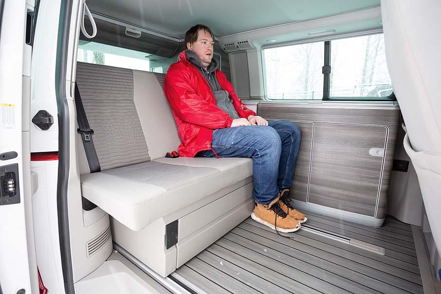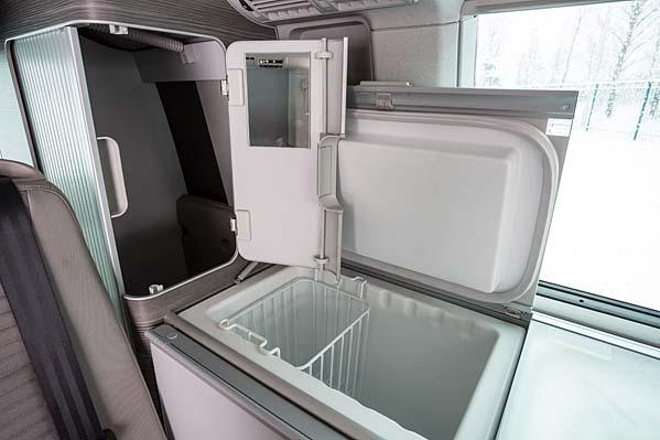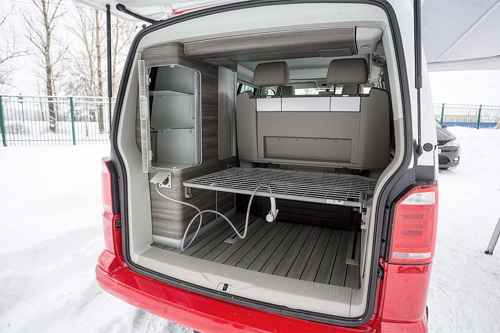У California возможности для трансформации не такие впечатляющие, но подкупает немецкий минивэн другим. Если Pacifica это небольшая квартира, то Volkswagen – настоящий дом на колесах со всеми необходимыми удобствами, в числе которых наличие газовой плиты, раковины и душа. В этой полноприводной гостинице действительно можно жить. Кухня хоть и небольшая, но полноценная, со множеством полочек и отделений. Для размещения кухонной утвари и другого скарба это очень удобно, но есть и минус – всю поклажу нужно тщательно закрепить, иначе во время движения она будет постоянно напоминать о своем присутствии дребезжанием и звоном.