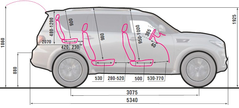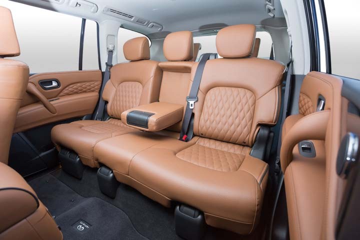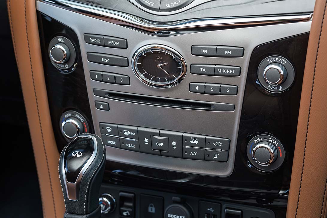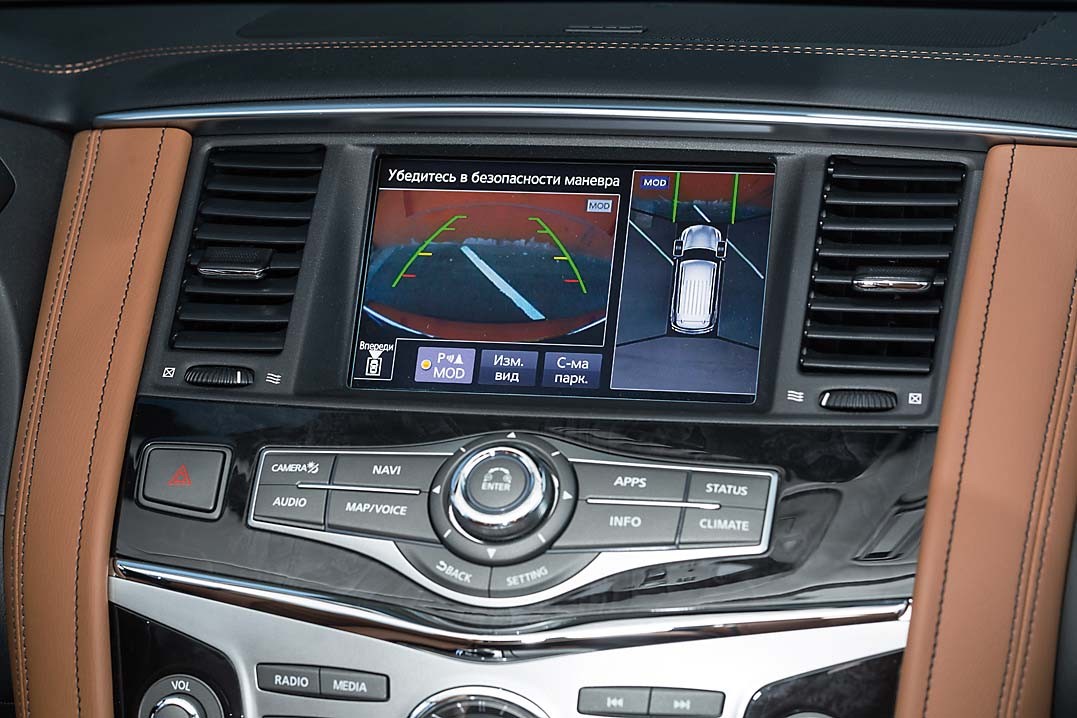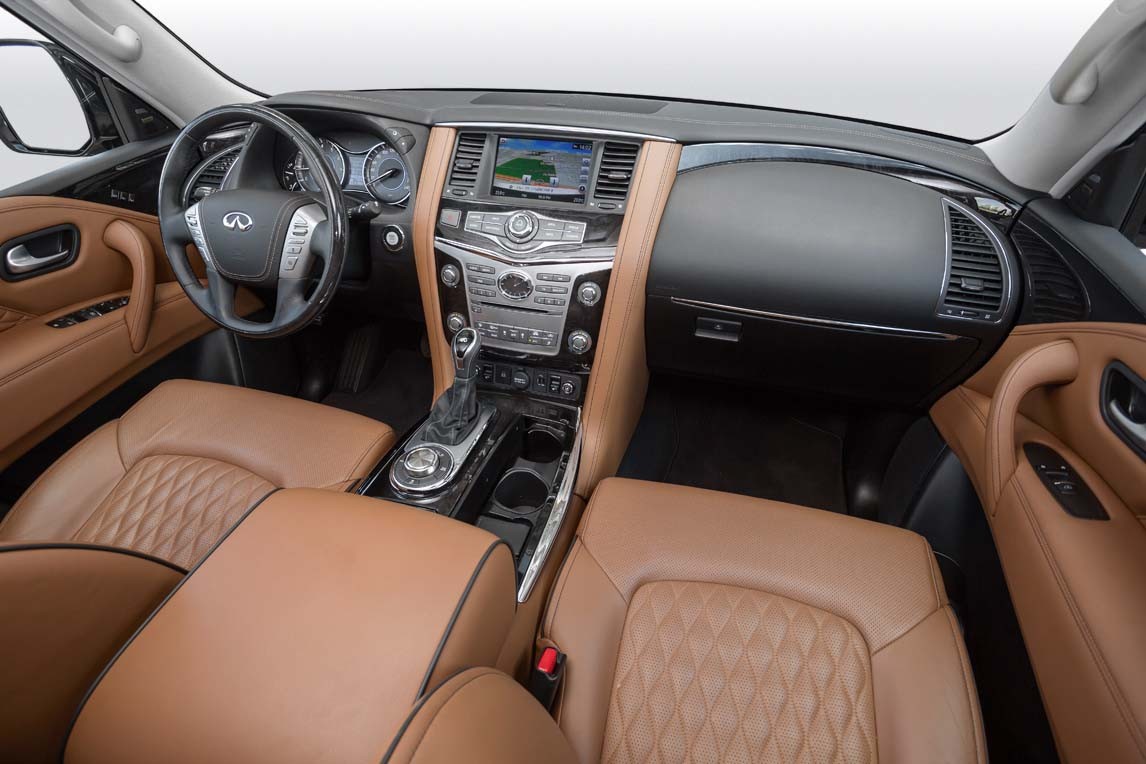 У японского внедорожника кузов такой же по размеру, зато колесная база на 165 мм больше, чем у стандартного «американца». Оказывается, этой прибавки достаточно, чтобы можно было расположиться на диване со всеми удобствами, а складные детские кресла годились бы не только для «переноски» с котом. Но парада графических инсталляций от Infiniti не ждите. Разумеется, он пытается шагать в ногу со временем. Кроме навороченной мультимедийной системы In Touch c 8-дюймовым экраном высокого разрешения в автомобиле установлены два больших дисплея для развлечения задних пассажиров. В стандартное оснащение входят и камеры кругового обзора. В то же время панель приборов аналоговая, а управление климат-контролем и информационно-развлекательным комплексом осуществляется с помощью физических кнопок. Немного консервативно, зато весьма удобно.