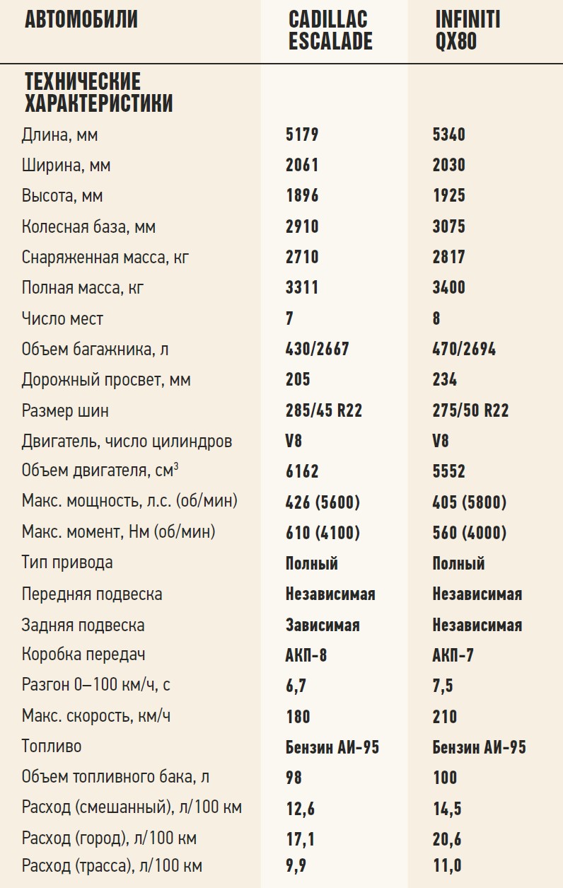 По части силовых агрегатов консерваторы оба. Никаких тебе турбин, только классические безнаддувные V8. В арсенале Infiniti 5,6-литровый двигатель семейства VK, работающий в паре с гидромеханическим 7-ступенчатым автоматом. Литраж «восьмерки» Escalade еще больше – 6,2 л, а коробка 8-диапазонная. Трансмиссии того и другого – с постоянным полным приводом, жесткой блокировкой центрального дифференциала и пониженным рядом.