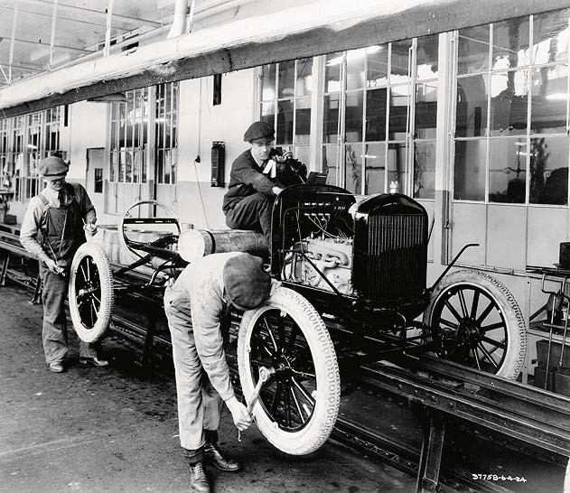 Простота конструкции не означала ее примитивность. Тормоза, например, стояли только на задней оси. Зато 2,9-литровый 4-цилиндровый 22-сильный двигатель с увеличенной степенью сжатия впервые имел не составной блок, а цельнолитой с отдельной съемной головкой. Система смазки с разбрызгиванием и охлаждение без насоса применялись и на более дорогих моделях. Двухступенчатая планетарная коробка переключалась прогрессивно – педалями и рычагом. Кстати, органы управления своим детищем Форд организовал без оглядки на конкурентов, с расчетом на удобство и в угоду все той же технологии массового производства. Поначалу водить Model T считалось особым умением. Дроссель регулировался рычажком. Рычаг передач служил одновременно для блокировки ручного тормоза, педалью сцепления приходилось ловить «нейтраль», а соседняя включала задний ход. Электрический стартер появился лишь спустя десятилетие от начала производства. Первые владельцы обходились рукояткой «кривого».