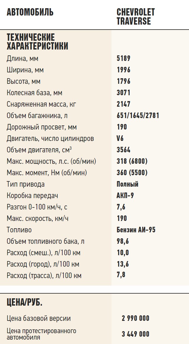 Конечно, язык не поворачивается и рука не поднимается назвать Traverse (произносится «Травёрс») доступным при начальной цене 2 990 000 рублей. Но много ли вы знаете семи- и восьмиместных SUV сопоставимого размера, которые будут принципиально дешевле? То-то. И к тому же Traverse – из тех автомобилей, которые выбирают не сердцем, как тот же Tahoe или Camaro. Только рассудок и анализ аргументов «за» и «против»! Что же это за аргументы?