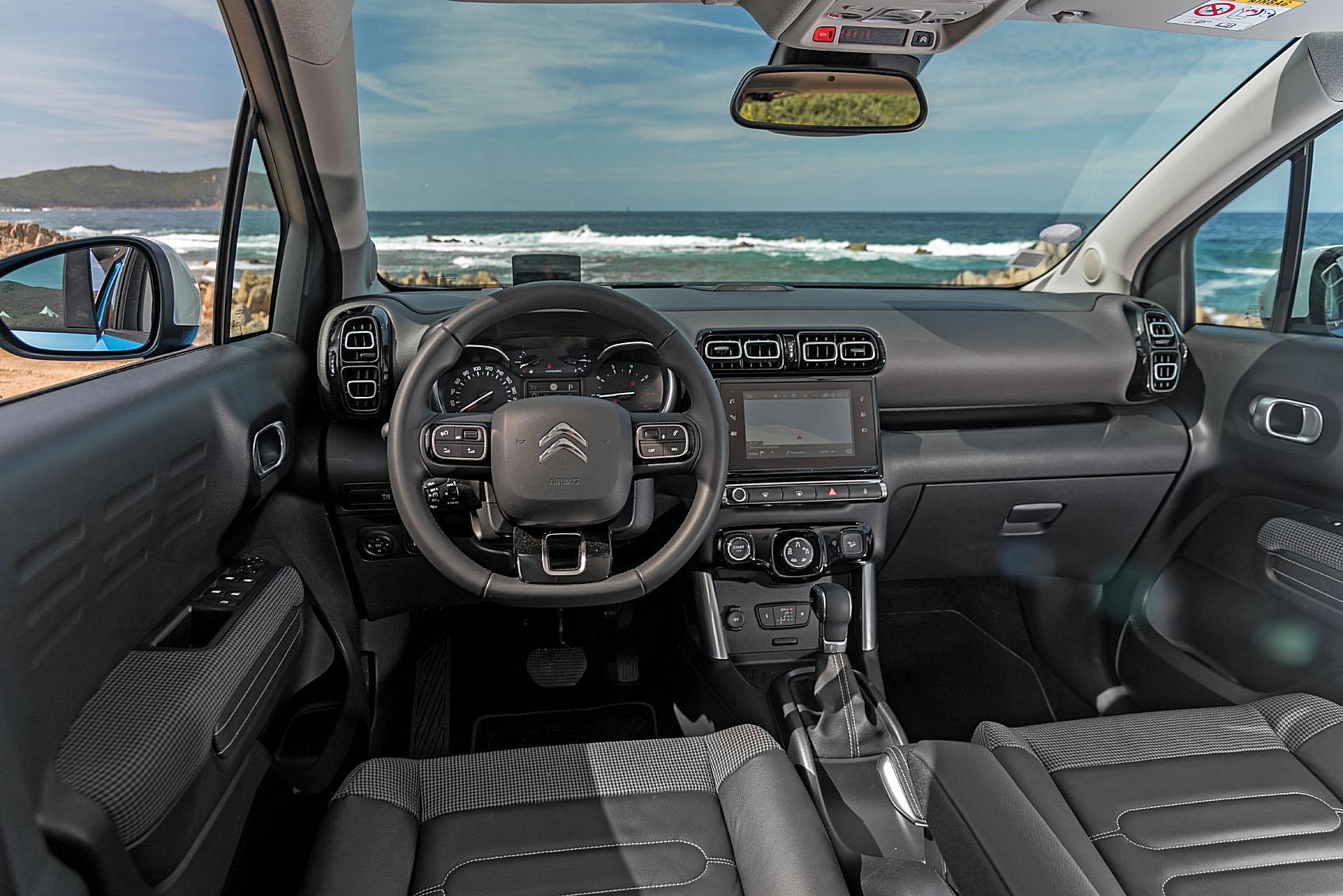 «Многоуровневая» передняя панель может быть снабжена прорезиненной полочкой с пассажирской стороны или частично обшита тканью. Дефлекторы обдува сложной формы можно заказать с цветными глянцевыми вставками. Для обивки кресел предусмотрены ткани в мелкую клеточку, которые больше ожидаешь видеть в качестве материала для чьего-то пиджака или жилета, чем для обивки автомобильного сиденья. Все эти смелые дизайнерские решения настраивают на веселый лад. И в целом Citroen C3 Aircross смотрится свежо – в том числе на фоне примелькавшихся одноклассников.