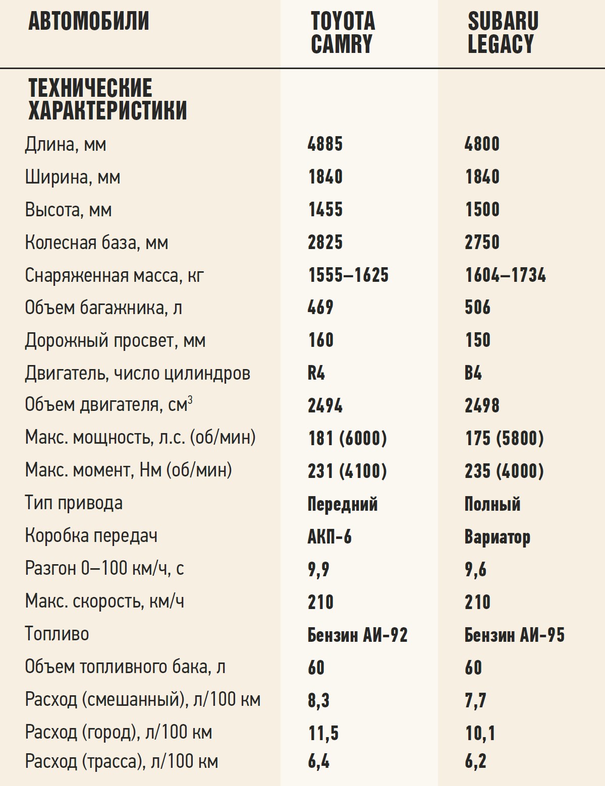 Toyota Camry сбить с намеченного пути крайне сложно. Лидер бизнес-класса по-прежнему не готов делить пьедестал ни с кем из конкурентов. Спасибо большому выбору версий и неплохому балансу цена-качество. Но все же Subaru Legacy вполне может стать тем соперником, который поборется с бессменным лидером. Не в вопросах стоимости базовых версий, а в том, насколько щедро укомплектованы средние и дорогие исполнения. На этом поле у «Легаси» есть все шансы потревожить покой «Камри».