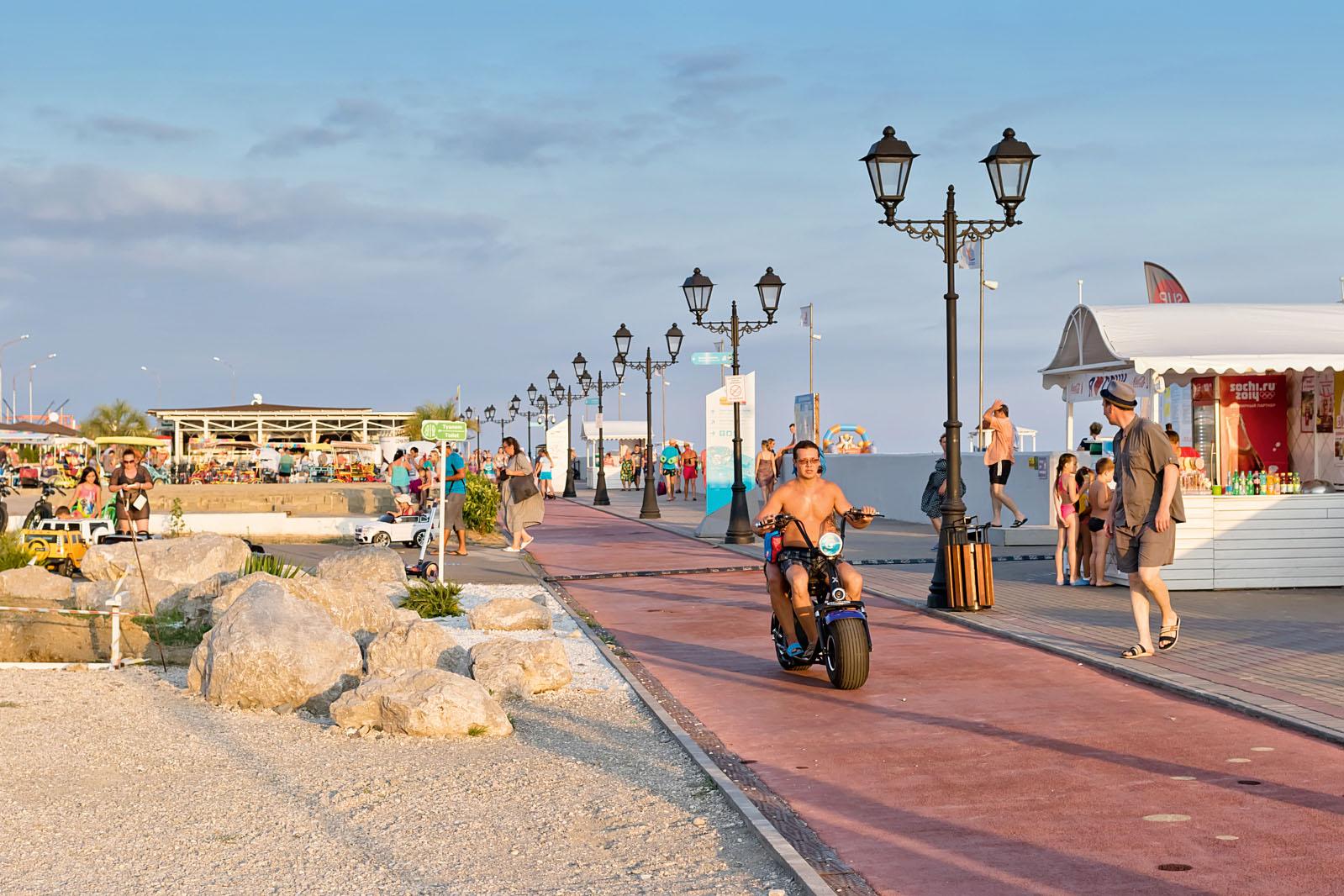 А теперь сопоставьте все эти требования с тем, что вы видели на курорте. Олимпийский парк в Сочи, приморские набережные, территории отелей и городков апартаментов просто забиты электроскутерами, за рулем которых сидят подогретые местными горячительными напитками седоки. Масса электроскутера: 50 – 70 килограммов. Прибавьте к ним как минимум полтора центнера веса рулевого с пассажиром и помножьте все это на возведенные в квадрат полсотни километров в час, на которых несется по забитой людьми набережной груда металла, пластика, жира и костей. В результате вы получите огромную кинетическую энергию, способную в доли секунды убить или покалечить несколько взрослых человек, не говоря уж про детей. Посадить за руль 10-12-летнего подростка – тоже не проблема. Отдыхать, так на полную! Что, вы еще хотели про мотошлем спросить?!