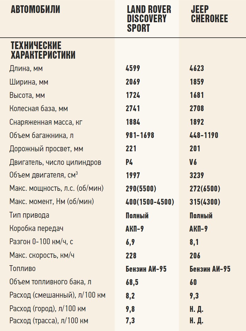 Самое значимое техническое новшество американской машины – доработанная система полного привода Active Drive I. Инженеры на 7,7 кг снизили вес муфты подключения колес задней оси и частично трансмиссионные потери. Все ради улучшения экономичности. На бумаге цифры среднего расхода топлива, и правда, выглядят привлекательно, но, увы, они не совсем соответствуют реальным. Безнаддувная 3,2-литровая, 272-сильная «шестерка» Pentastar выбранной нами для теста топовой версии Overland даже при очень нежном педалировании пьет минимум десять литров бензина на сотню километров. А уж если поднажать, чему покладистый характер двигателя весьма способствует, получишь все пятнадцать. Рядный 4-литровый мотор 2.4 процентов на двадцать экономичнее, но его возможностей на трассе хватает, что называется, впритык. Land Rover Discovery Sport на сегодняшний день пользуется только оснащенными турбинами 2-литровыми «четверками» нового семейства Ingenium. В нем три дизеля мощностью 150, 180 и 240 л.с и пара бензиновых агрегaтов с отдачей 240 и 290 «лошадей». На рыжем Discovery стоит наиболее мощный, немного превосходящий по силам топовый мотор Сherokee. Но если сравнить крутящий момент и разгонную динамику, преимущество «британца» убедительное.