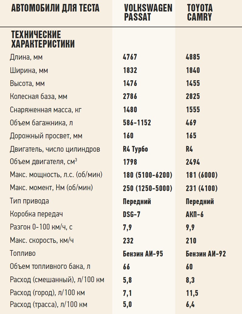Passat уже давно не предлагает нам атмосферные моторы, а классическим гидромеханическим автоматам предпочитает преселективные роботы DSG. Да, самая доступная модификация стоит сейчас в России не дороже Camry. Цены – копеечка в копеечку. Но немецкая «база» куда скромнее японской. Мотор 1.4 TSI мощностью 125 л.с., 6-ступенчатая механическая коробка, кондиционер, штампованные диски. Климат-контроль можно выбрать из числа опций, но более удобную коробку и литые диски придется искать в комплектации следующего уровня. А за седан с сопоставимым с «тойотовским» по мощности 180-сильным двигателем с вас попросят минимум 1 879 000 рублей. Мы же поставили на максимум и взяли Passat в топе.
