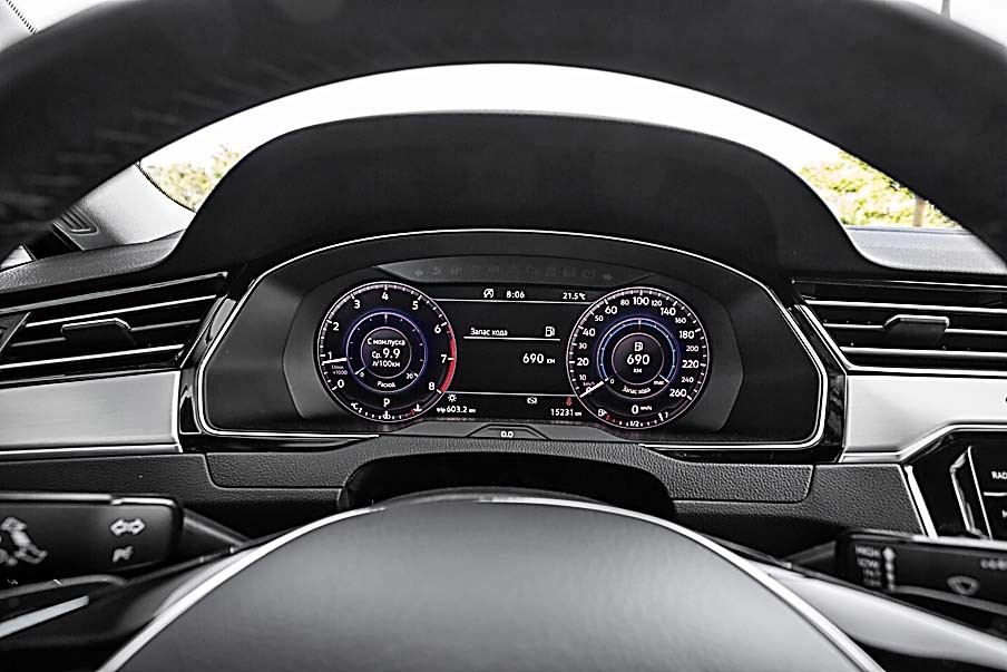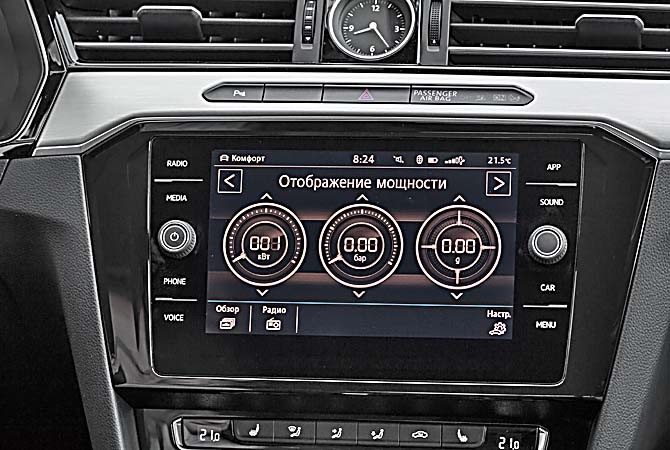 За рулем «Пассата» испытываешь двоякое чувство. Первое впечатление такое, словно интерьер немецкого седана создавали не дизайнеры с фантазией и вдохновением, а инженеры с циркулем и линейкой. То что они в итоге начертили сильно напоминает офис. К его отделке и цветовой гамме не придерешься, но это лишь фоновые декорации, главные же визуальные элементы – интерактивная панель приборов и сенсорный дисплей мультимедийной системы. Кроме этих двух, установленных как будто для презентаций экранов глаз ни за что не цепляется.