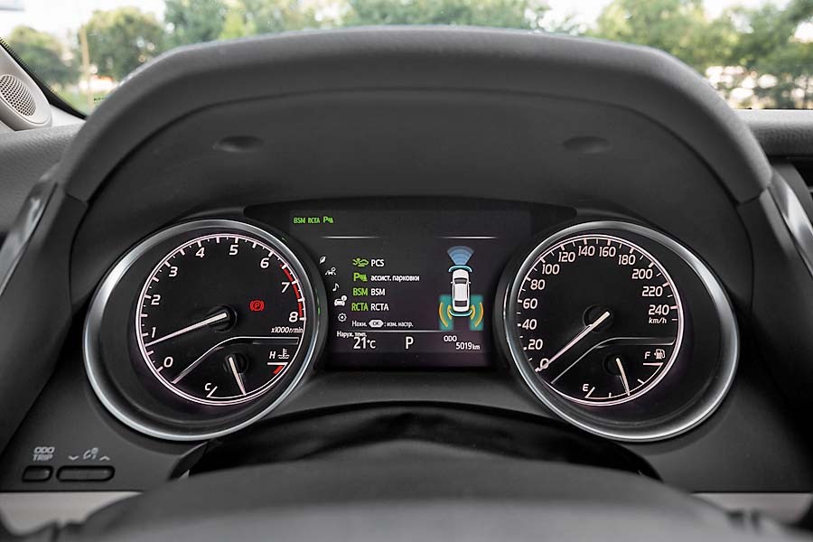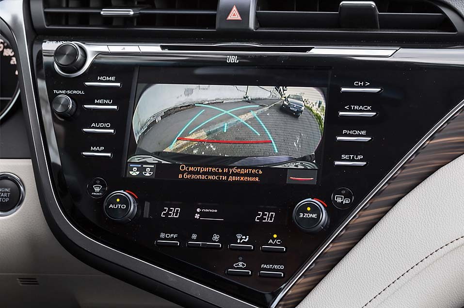 Салон Camry выглядит затейливее, чем у модели предыдущего поколения и чем у «Пассата». Изящные изгибы и сложный рельеф «торпедо», экстравагантная центральная панель и выполненные в классическом стиле приборы искусно собраны в единое целое. Не поскупилась Toyota и на оснащение. Все комплектации, начиная с «Элеганс», включают пакет «Зимний комфорт» с подогревом всех кресел, рулевого колеса и ветрового стекла. У передних сидений появилась вентиляция. Устроена Camry интересно, удобно и все же не безупречно. Центральный дисплей на приборной панели недостаточно контрастен и, как нам показалось, перегружен лишним. Например, в режиме бортового компьютера большую часть 7-дюймового дисплея занимают пространные графики расхода топлива, при этом далеко не бесполезный цифровой индикатор скорости ютится в правом верхнем углу и едва заметен. Оставляет желать лучшего интерфейс и графика штатного навигатора. Да и применяемые в отделке виниловые накладки дерево изображают не убедительно.