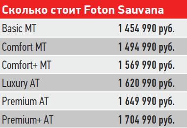 При разработке модели Sauvana маяком-ориентиром для Foton послужила японская Toyota Fortuner. И надо признать, что по первым впечатлениям среднеразмерный внедорожник получился достаточно неплохим. Причем по вполне доступным ценам – в комплектации Basic он стоит менее 1,5 млн руб. В ней имеются: кондиционер, две подушки безопасности, легкосплавные колесные диски; электронные системы – стабилизации, помощи при спуске и подъеме, контроля давления в шинах; галогенные фары, «противотуманки», светодиодные ходовые огни и задние фонари, обогрев наружных зеркал, парктроник. Сзади также предусмотрены отдельный отопитель и розетка на 12 В. В топ-версии Premium+ (1 704 990 руб.) еще и камера заднего вида, 7-дюймовый монитор, климат-контроль, круиз-контроль и кожаная отделка сидений.