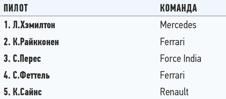 На рестарте Себастьян Феттель ринулся в атаку за первую позицию на Валттери Боттаса, но заблокировал колеса и в первом повороте пропустил Хэмилтона и Райкконена вперед. А чуть позже и Серхио Перес обогнал Феттеля, у которого упал темп из-за вибраций в шинах после блокировки колес. Боттас совсем чуть-чуть не дотянул до победы, буквально на последних кругах Валттери проехал по обломкам на трассе, получил прокол и сошел, не доехав до боксов. Так победа и свалилась на Льюиса. Вторым финишировал Кими, а третье место удержал Перес. Россиянин Сергей Сироткин сошел с дистанции на первом круге гонки. Более того, не исключено, что за борьбу с Серхио Пересом Сергей потеряет три позиции на старте Гран При Испании.
