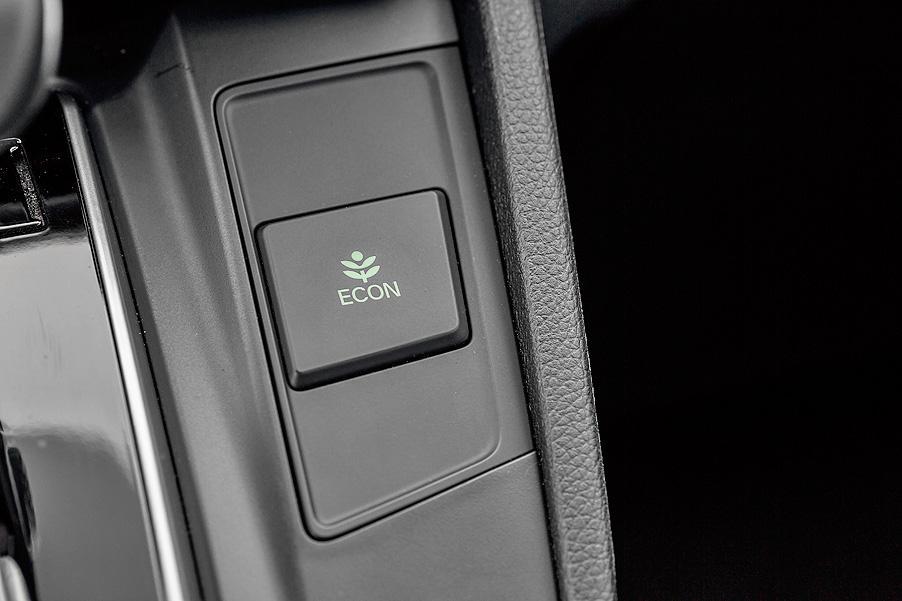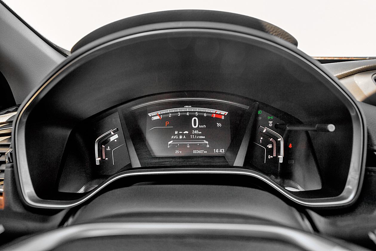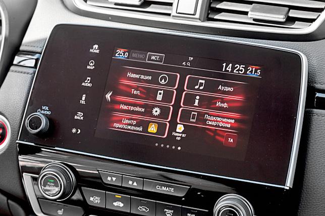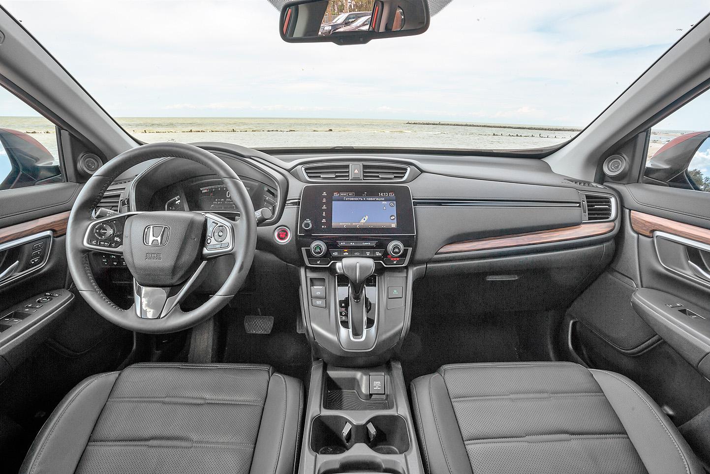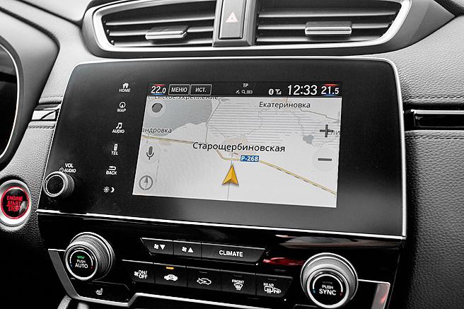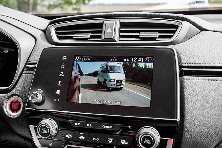 Клавиш на рулевом колесе ощутимо прибавилось – тут и управление мультимедиа и проекционным дисплеем, и подогревом руля… Неудобств это, впрочем, не причиняет, эргономика салона на хорошем уровне. А вот с системами помощи водителю все не так гладко. В топовых комплектациях CR-V оснащен боковой обзорной камерой, которая располагается в корпусе правого зеркала заднего вида. Это своеобразная замена системы контроля слепых зон: благодаря камере площадь обзора в самой опасной «мертвой» зоне со стороны переднего пассажира увеличивается в 4 раза. Но есть и побочный эффект – изображение с камеры выводится на центральный дисплей при включении указателя поворота. При использовании навигации это не слишком удобно, так как изображение занимает весь экран. Хотя функция безусловно полезная, она помогает не только при перестроении, но и во время парковки. К счастью, привязку камеры к подрулевому рычагу можно отключить через меню и активировать ее с помощью отдельной кнопки, когда это необходимо.