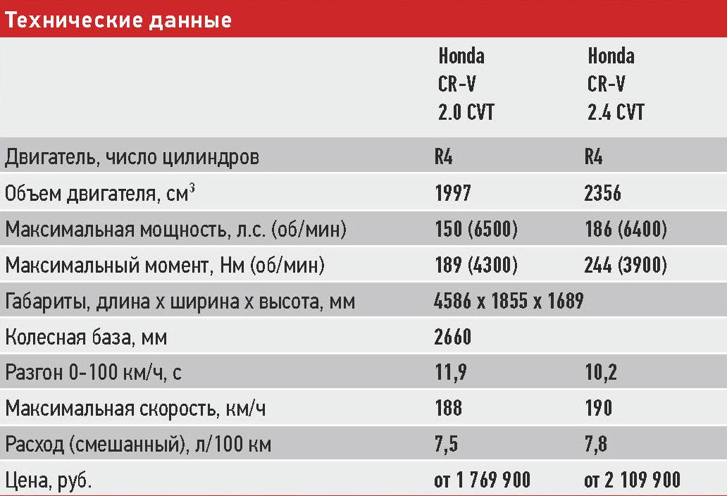 Автомобиль предлагается в России с атмосферными моторами объемом 2,0 и 2,4 л, мощностью 150 и 186 л.с. соответственно. Старший в линейке агрегат, знакомый по предыдущему поколению модели, впечатлил и порадовал. Несмотря на то, что по паспорту эта модификация CR-V разгоняется до 100 км/ч за 10,2 с, вялым или скучным ускорение вовсе не кажется. Благодаря отличной связке мотора и вариатора разгоняется кроссовер напористо, причем утапливать педаль акселератора в пол не приходится даже при обгонах на большой скорости.