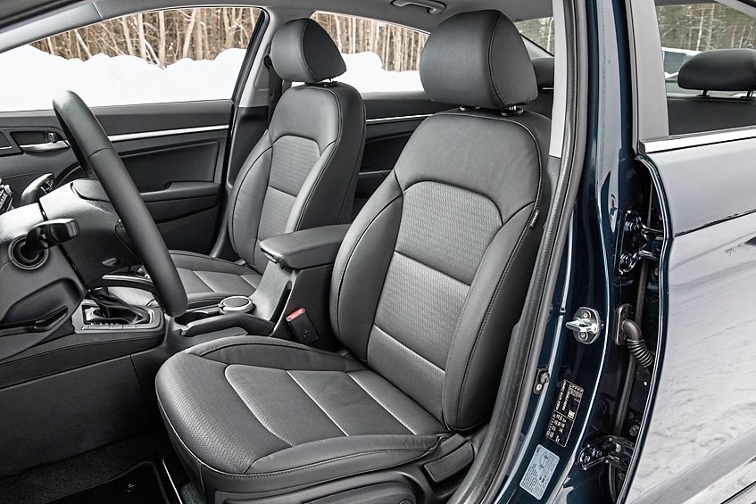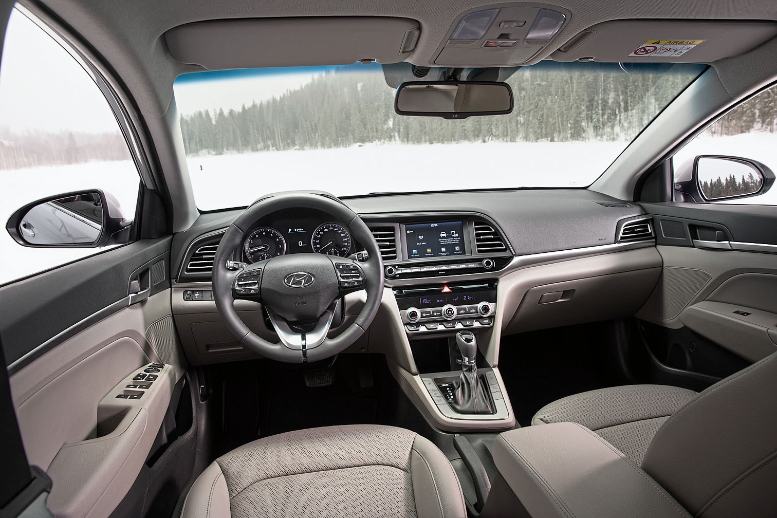 В салоне обновления менее радикальны: Elantra получила новую центральную консоль (изменилась форма ее козырька и вентиляционных дефлекторов), также появился иной блок управления климат-контролем. Приборная панель также обращает на себя внимание: шкалы спидометра и тахометра снабжены подложкой с «клетчатой» фактурой. Восприятию информации декор не мешает – корейцам удается делать удобные приборы.