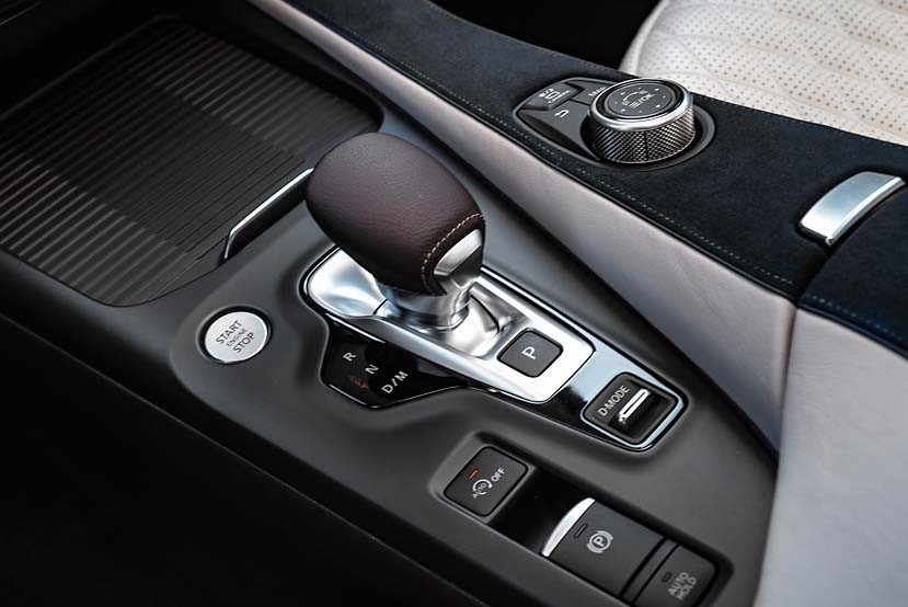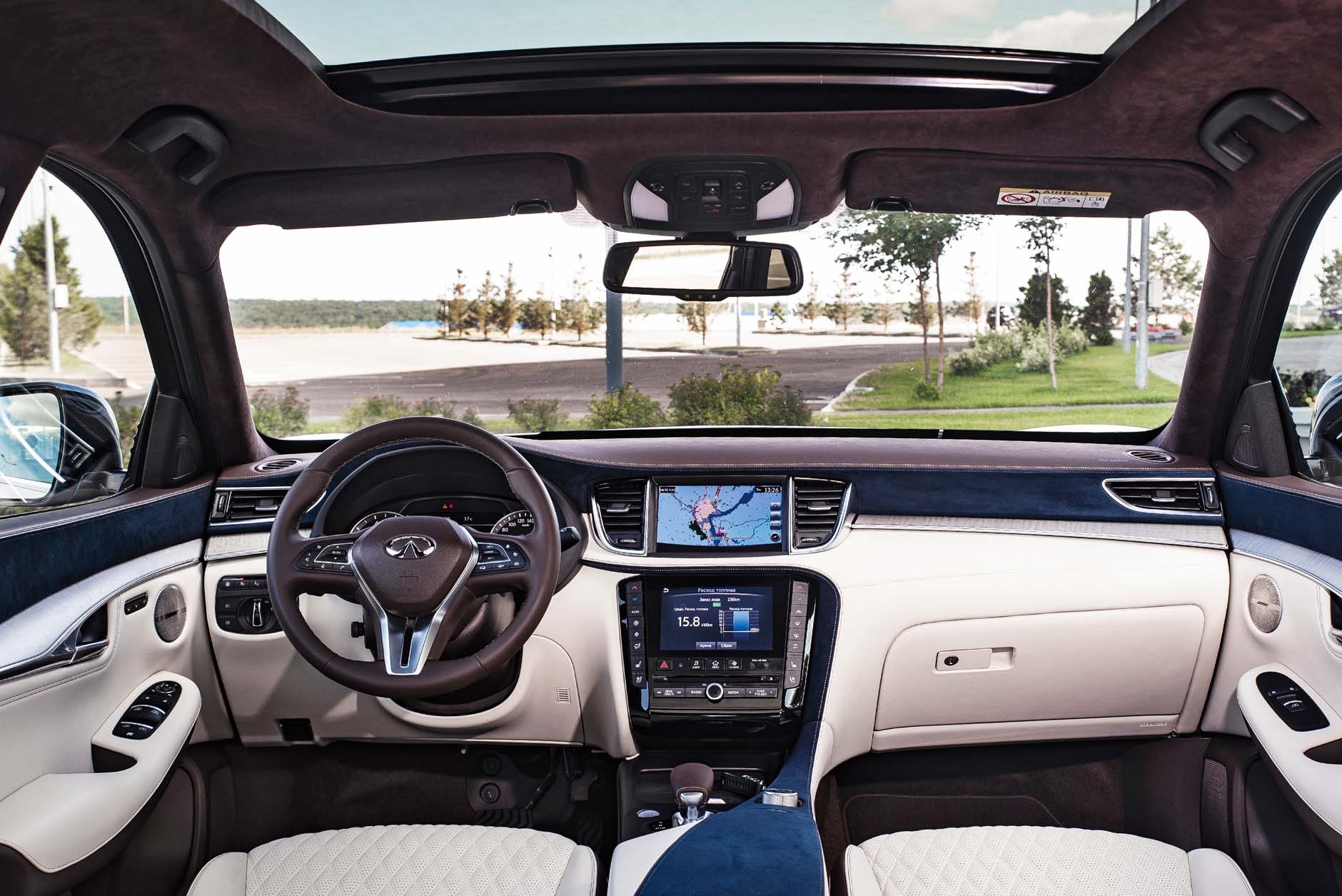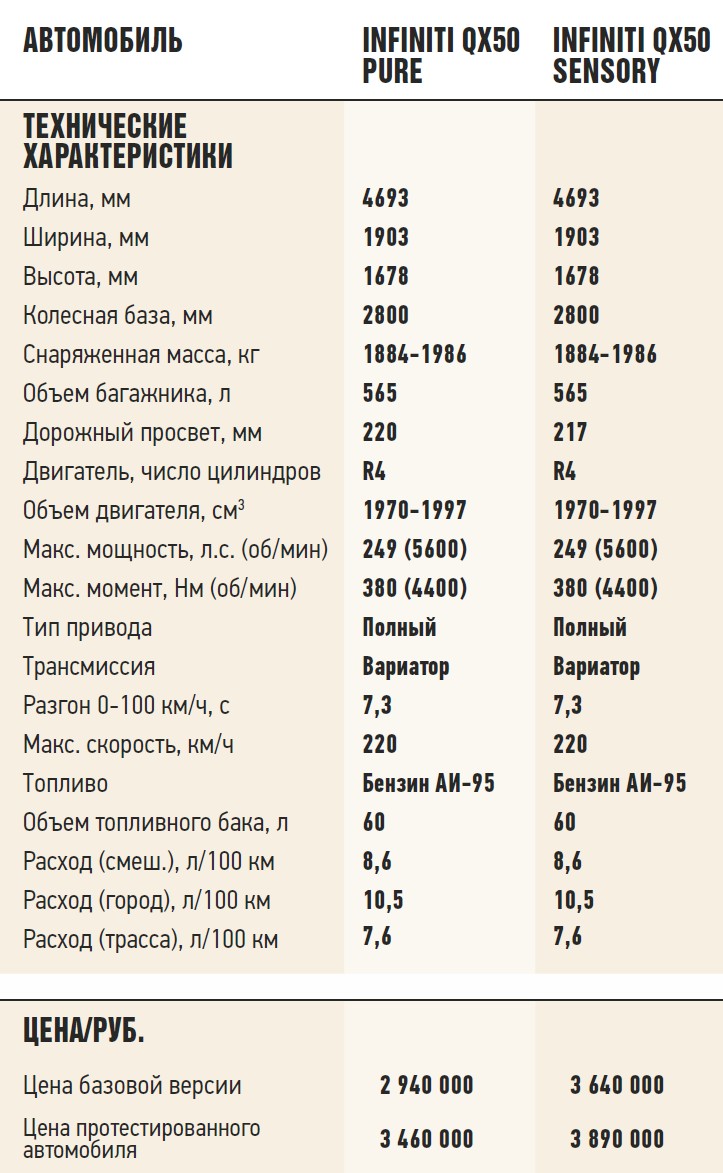 На ходу двигатель Infiniti QX50 демонстрирует достойную динамику в широком диапазоне оборотов и тянет очень ровно. Звук мотора специфический, но не навязчивый. К тому же для того, чтобы нивелировать пиковые значения шумов и вибраций, применяется активная верхняя опора двигателя. Для той же задачи служит и система шумоподавления через динамики аудиосистемы, а также традиционная шумоизоляция. Получилось и вправду достойно – даже на шершавых загородных дорогах можно спокойно разговаривать вполголоса, без необходимости переспрашивать каждое слово. Турбомотору QX50 ассистирует вариатор – трансмиссия, как известно, бесступенчатая, но в данном случае старательно маскирующаяся под АКП с восемью передачами – что в спортивном режиме, что в расслабленном Eco. Менять виртуальные «ступени» можно и подрулевыми лепестками. Однако необходимость в этом возникает разве что на затяжных спусках – в обычном режиме движения агрегат работает более чем адекватно.