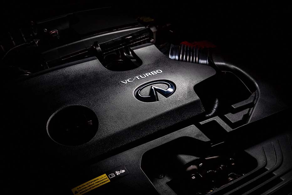 Новый 2,0-литровый турбомотор с индексом VC-Turbo позволяет менять степень сжатия в пределах от 8:1 до 14:1 за счет изменения хода поршня. Шатун в этом моторе крепится не прямо к шатунной шейке коленчатого вала, а к специальному коромыслу. Другое плечо коромысла через систему тяг соединено с электромотором, который и меняет положение поршня с шатуном относительно камеры сгорания. При низких нагрузках двигатель работает с максимальной степенью сжатия, обеспечивая экономичность, а при высоких – степень сжатия уменьшается, мотор становится «короткоходным» и обеспечивает более высокую мощность. Подача топлива комбинированная – сочетание непосредственного и распределенного впрыска. Мощность для России составляет выгодные в налоговом отношении 249 л.с. Вот такая занимательная механика. Представители Infiniti настаивают на том, что двигатель с изменяемой степенью сжатия запущен в серийное производство впервые, а до этого – испытан с японской дотошностью.