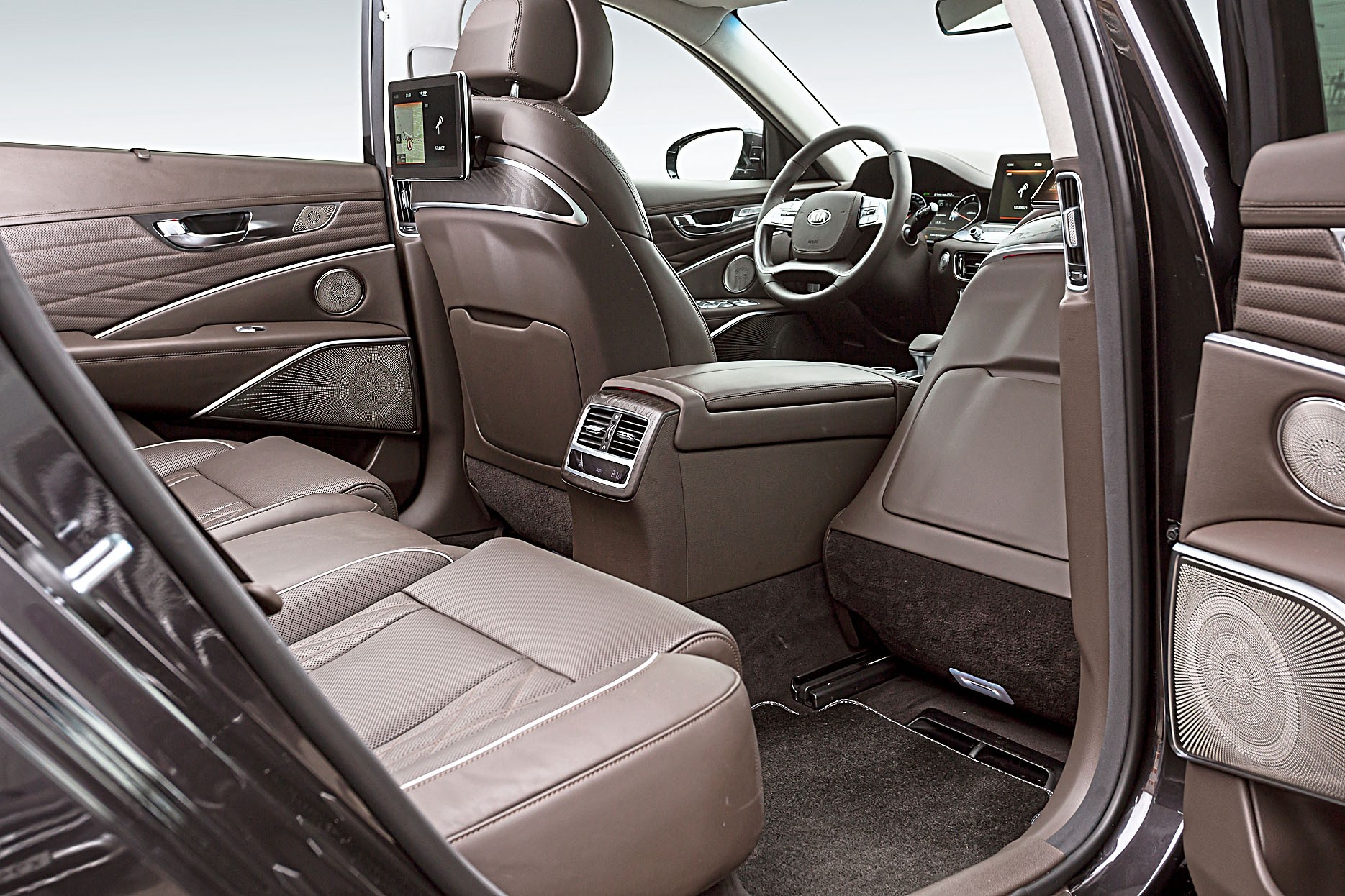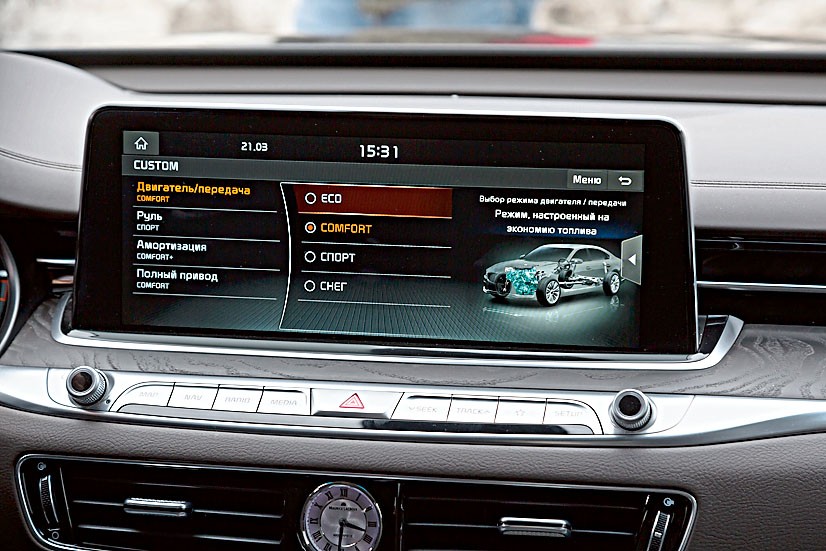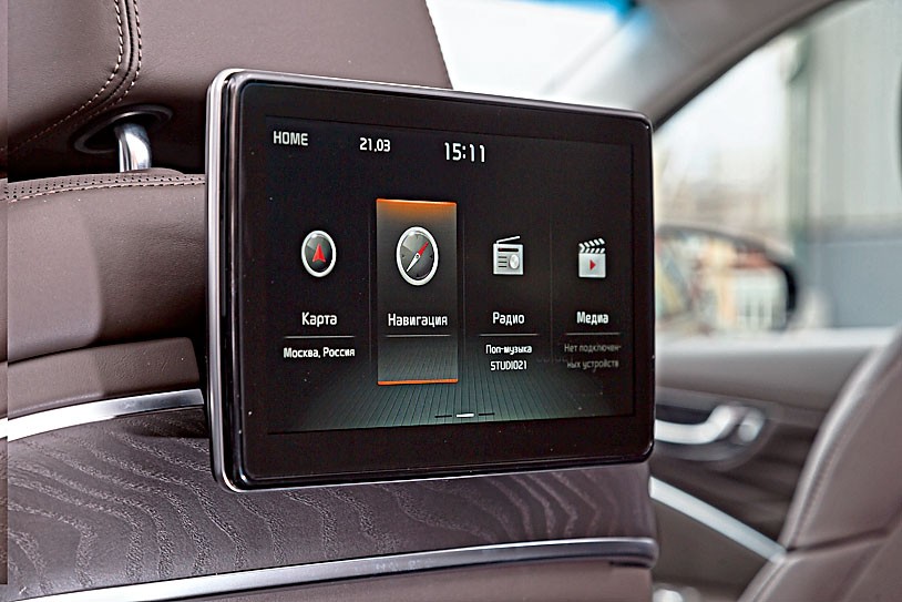 Главное место в K900 – справа сзади. Сдвинув переднее кресло до упора вперед, можно получить очень приличную площадку для ног, да и по высоте седан «не жмет». Кроме того, здесь можно расположиться полулежа, регулировки позволяют. Плавность хода – определенно лучше, чем у многих зубодробительно жестких конкурентов из числа седанов бизнес-класса. За развлечения отвечают экраны на спинках кресел. Графика четкая, интерфейс понятен. Категорически рекомендуем поездки именно на втором ряду!