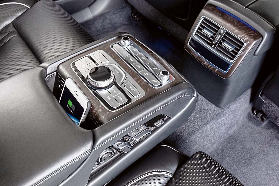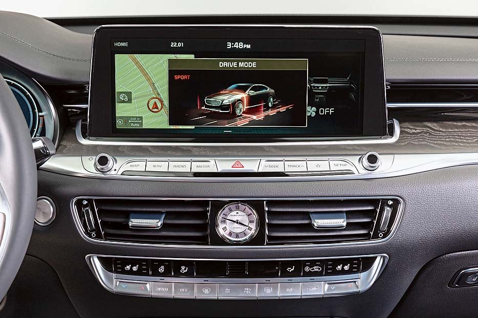 В распоряжении самых главных пассажиров сзади – все необходимые атрибуты, позволяющие автомобилю гордо носить звание «настоящий бизнес-класс». В массивном центральном подлокотнике спрятан «центр управления», с помощью которого пассажиры могут изменять температуру в салоне, «командовать» мультимедийной системой и навигацией. Кроме того, на спинках передних кресел расположили экраны, на которые выводится вся необходимая в путешествии информация. Но вот пролистывать меню прикосновением к монитору не получится – экран-то не сенсорный. Для этого есть специальный контроллер в центре «пульта управления». В целом, алгоритм взаимодействия человека с автомобилем продуман хорошо. Есть тут даже кнопка, которая «блокирует» все остальные клавиши, чтобы пассажир ненароком не сбил настройки той же климатической системы. Она, к слову, в Kia K900 по умолчанию трехзонная. Представители корейской компании говорят, что не видят смысла устанавливать климат-контроль для четырех зон салона – довольно дорого и в общем-то бессмысленно.