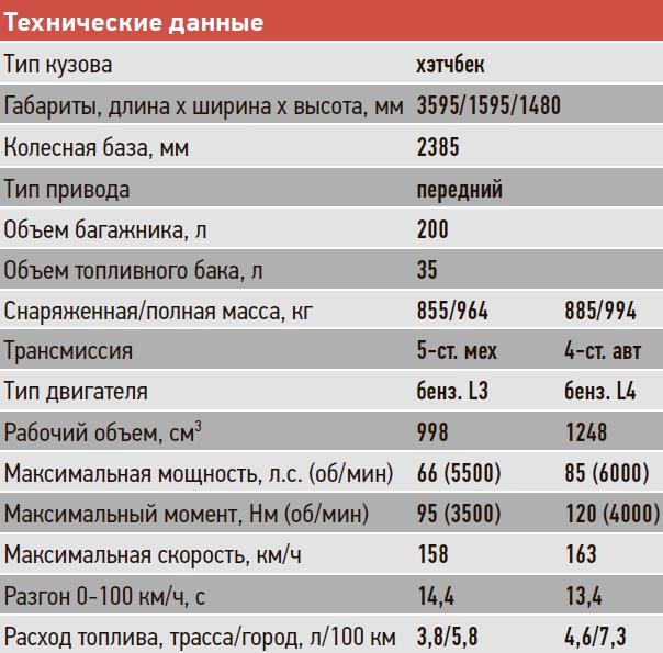 В России хэтчбек продавали с двумя бензиновыми моторами с распределенным впрыском топлива. Базовым остался модернизированный 3-цилиндровый 1.0 MPI на 66 «лошадок». В паре с ним работает 5-ступенчатая «механика». Тандемчик надежный, но не шибко бойкий (14,4 с до сотни). Впрочем, свои максимальные 158 км/ч за полминуты он развивает. Вторым номером шла чуть более взрослая «четверка» 1.2 MPI мощностью 85 л.с., которой полагался 4-ступенчатый автомат. И была она всего на секунду быстрее в спринте. Эту версию, кстати, многие до сих пор недолюбливают за несоразмерно высокий для таких размеров и мощности расход топлива.