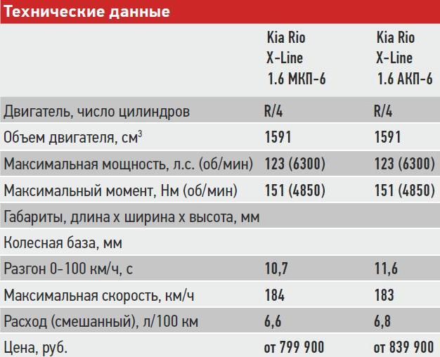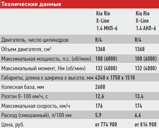 В отличие от седана с недорогими и небогато оснащенными базовыми версиями, начальной для Kia Rio X-Line считается версия Comfort. Она оборудована, в частности, фронтальными подушками безопасности, АБС, системой курсовой устойчивости, кондиционером, электростеклоподъемниками и другими полезными вещами. Базовый двигатель для такого Rio – 100-сильный 1.4, однако по итогам тест-драйва мы можем судить лишь об автомобилях с 1,6-литровым 123-сильным мотором и 6-ступенчатой АКП в старших комплектациях Prestige AV и Premium.