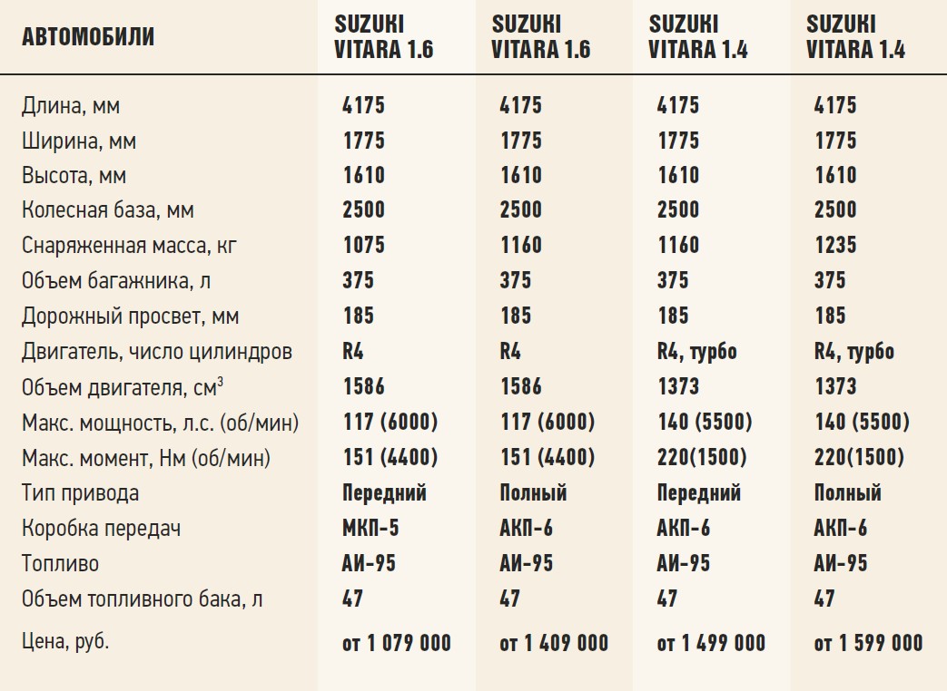 Vitara наверняка ждет еще множество ролей в кино, ведь это глобальная модель, которая продается во многих странах мира. Купить японский кроссовер с породистой внедорожной родословной можно и в России. Дилеры предлагают на выбор два двигателя: атмосферный 1.6 и турбированный 1.4 мощностью 117 и 140 л.с. соответственно. В базовой версии автомобиль доступен с менее мощным агрегатом, механической коробкой передач и передним приводом. Такая Vitara обойдется в 1 079 000 рублей. Полноприводная версия – с атмосферным двигателем или с турбомотором, но последнему положена только автоматическая коробка передач.