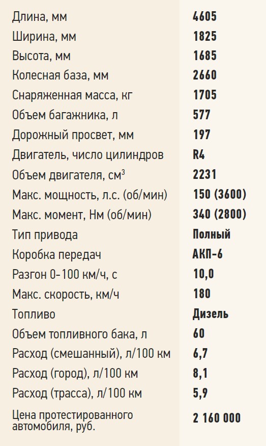 Будет тяжело. Это мы о выборе, который предстоит сделать человеку, принимающему непростое решение: бензин или дизель. 150 турбодизельных «сил» с моментом 340 Нм в развесистой и единственно возможной комплектации «Престиж» за 2 160 000 рублей против того же «Престижа», но с бензиновым 180-сильным мотором объемом 2,5 л за 2 112 000 рублей. Поначалу казалось, что подобный выбор сродни вульгарному материализму. Однако, прокатившись на дизеле, поняли, что попали в тупик. В динамике дизель не уступает. У обеих 6-ступенчатый автомат, а не вариатор. Обе упакованы по высшему разряду версии «Престиж». Думаете, дизель дольше греется и хуже заводится в мороз? И здесь мимо. На морозе тарахтит исправно, а в салоне имеется кнопка автономного догревателя двигателя и этого самого салона. Кстати, догреватель можно включить дистанционно. И сесть в уже теплый автомобиль.