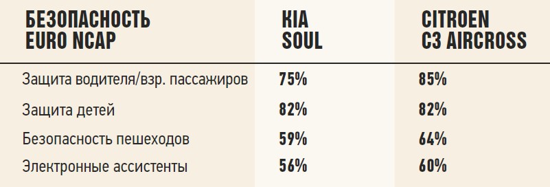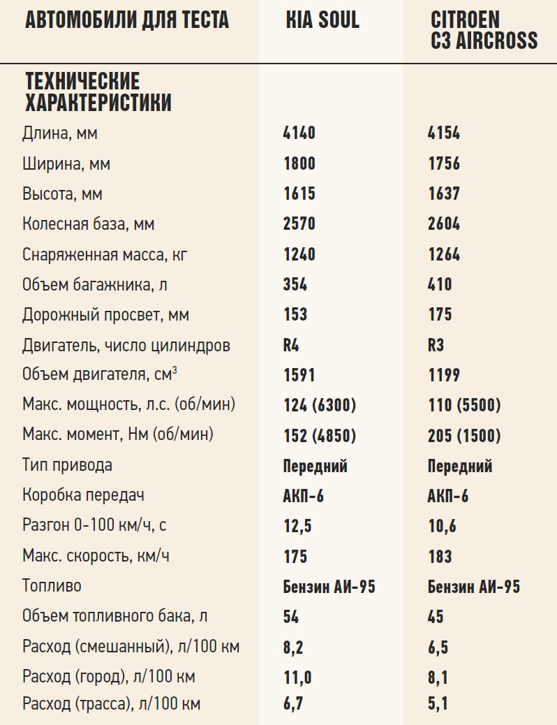 Есть еще одна дисциплина, где Citroen празднует бесспорную победу. Это динамика. На первый взгляд может показаться, что три цилиндра и 110 «лошадок» не смогут ничего противопоставить 125-сильной «четверке» Kia. Но за С3 Aircross играет турбина и обеспечивает хороший отрыв от соперника. «Француз» бодрее стартует с места и увереннее чувствует себя при обгонах на трассе. Воодушевление обоих заканчивается на отметке 140 км/ч. В принципе, они способны и на большее, но результата придется подождать. При этом оба не стесняются выражать свои чувства. Пришпоренный моторчик «Ситроена» громко хрипит, Soul немилосердно воет, что в определенной степени разжигает драйверский азарт. Хотя и тот, и другой, конечно же, не гонщики. С ними разумнее и приятнее обходиться ласково. Тогда и в салоне тихо, и автоматы меняют ступени без запинок.