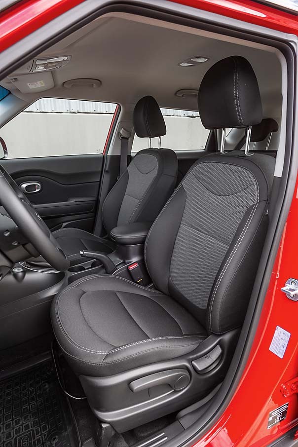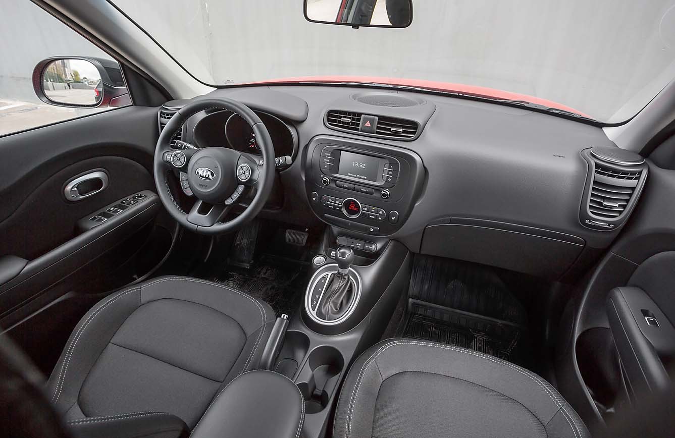 Несмотря на то, что колесная база Kia Soul на 34 мм короче, чем у оппонента, салон корейского автомобиля просторнее. Сидя на диване, крышу головой не подпираешь, а перед коленками есть запас пространства. И водительское кресло мне здесь понравилось больше, в основном из-за его плотной набивки и мускулистых валиков боковой поддержки.